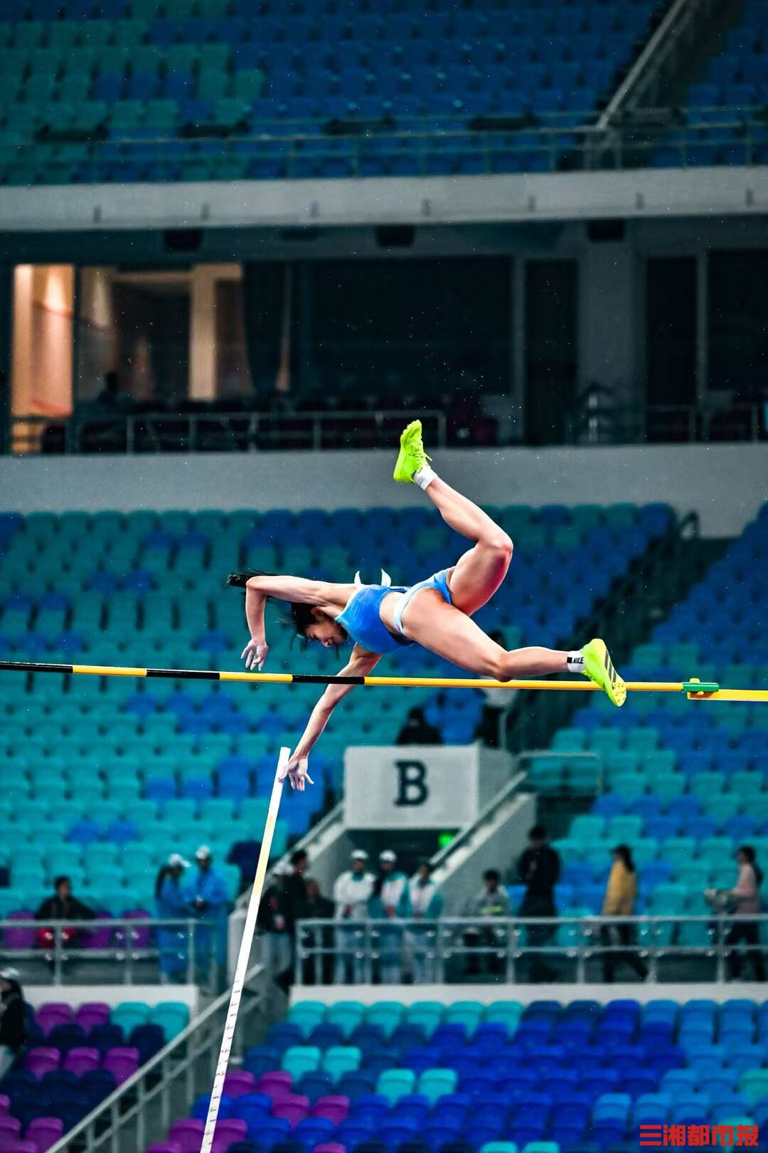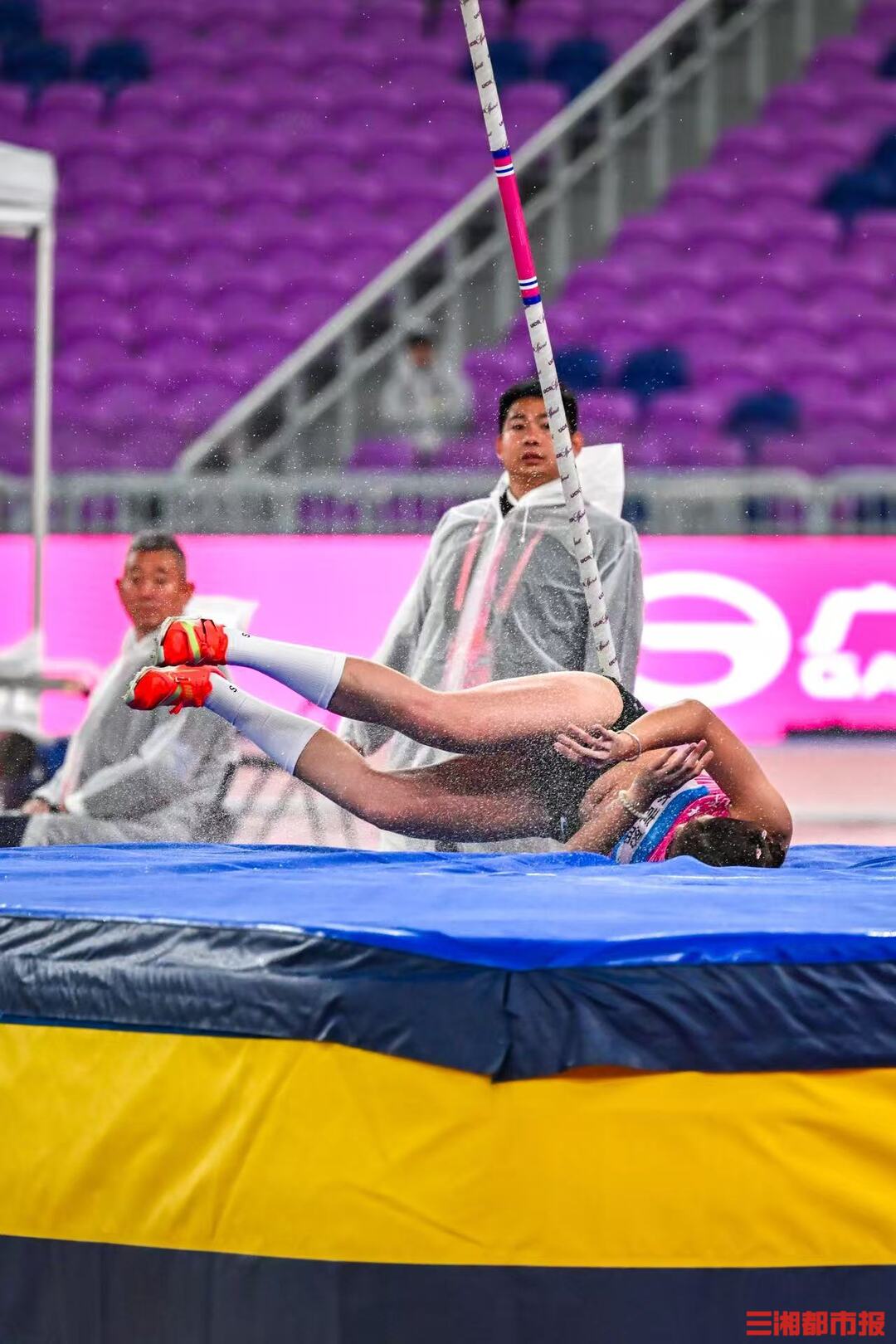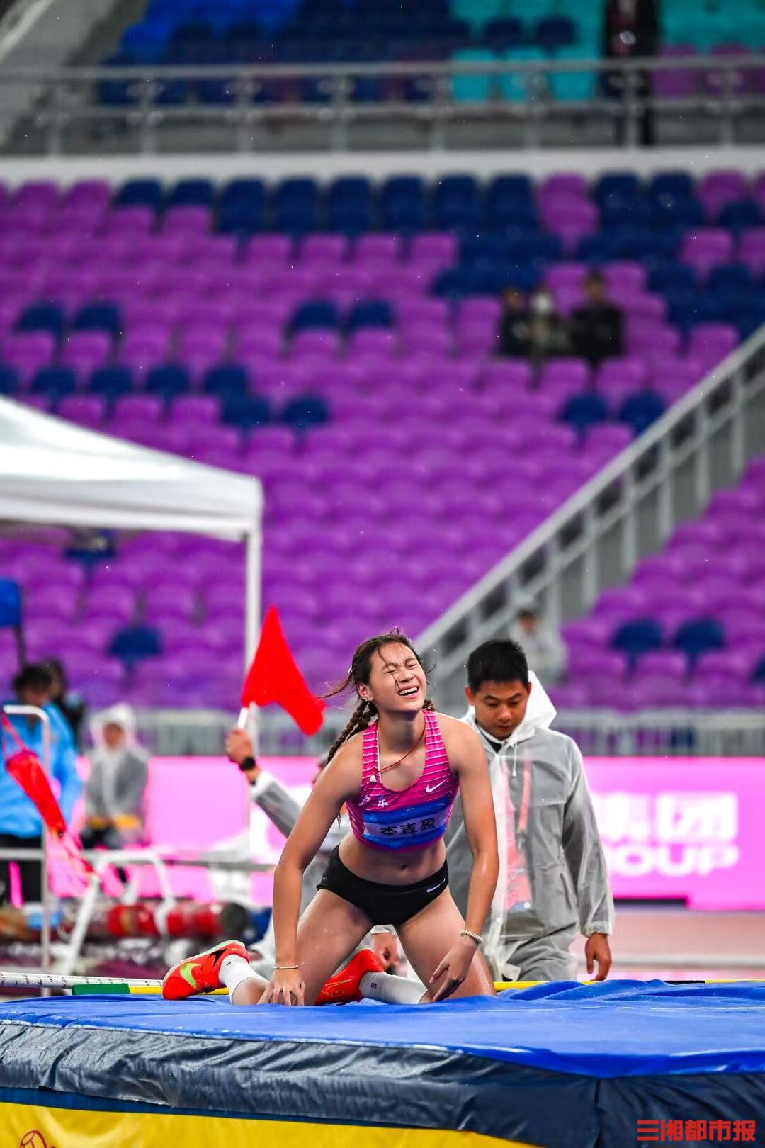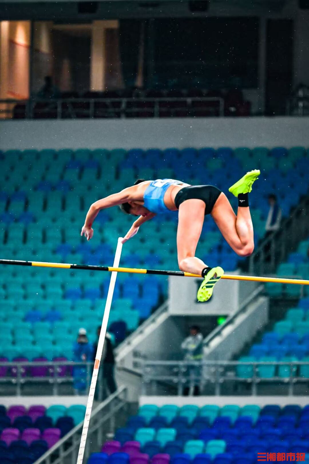 11 月 18 日,女子撑竿跳高决赛在广东省奥体中心体育场举行。压弯的撑杆似满弓,赛场上的选手英姿飒爽。(全媒体特派记者 刘丰 叶竹)