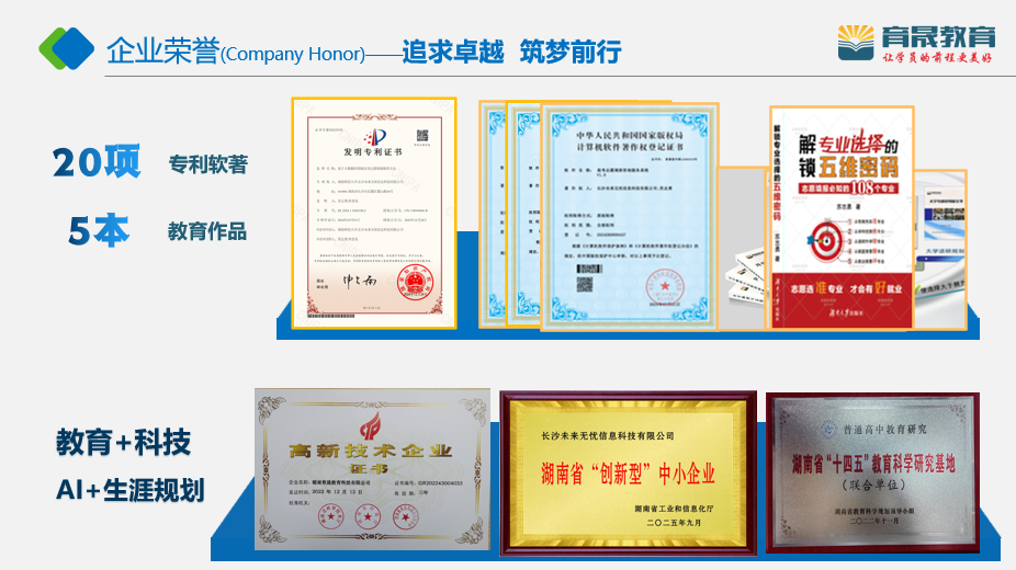 在其引领下,两家创办企业均展现出强劲的创新实力与发展潜力。其中,长沙未来无忧信息科技有限公司作为“省级创新型企业”和“国家级高新技术企业”,核心利用大数据与人工智能技术,开发了智能高考志愿填报系统、生涯测评工具等一系列科技产品;湖南育晟教育科技有限公司同样荣获“国家级高新技术企业”认定,专注于为大学生及青年群体提供升学规划、职业生涯咨询、就业创业能力培训与赋能服务。两家公司业务协同并进,形成了“技术驱动+深度服务”的双轮驱动模式。