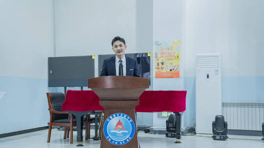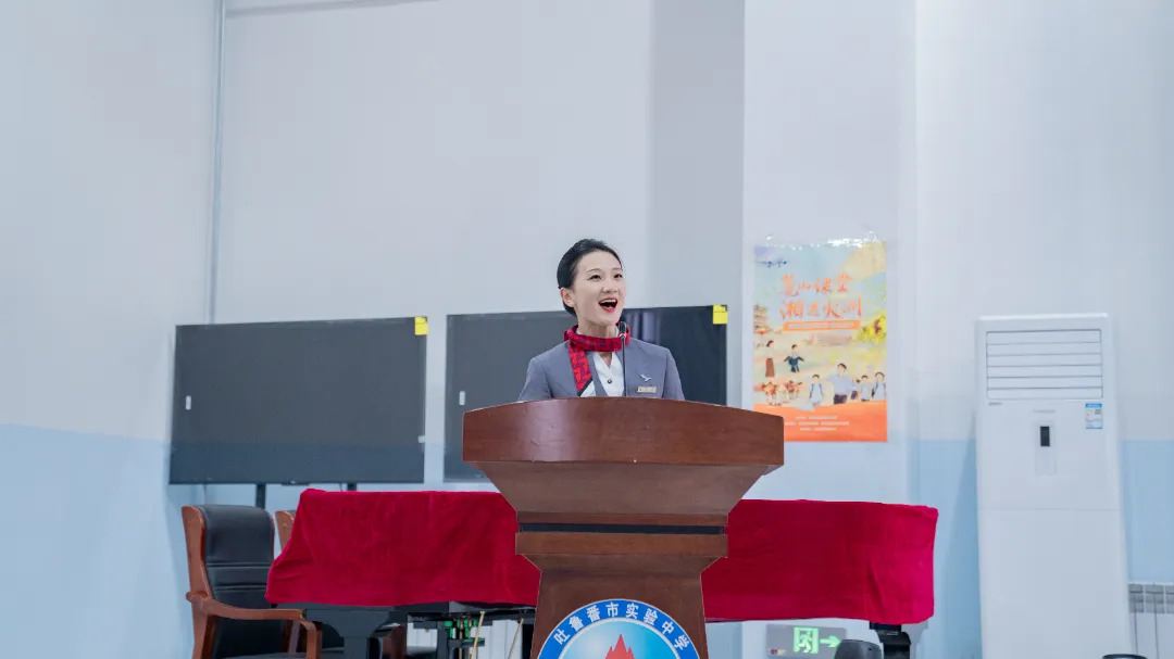 湖南航空乘务员王艺蓓、湖南航空飞行员李承霖、湖南航空乘务员袁辛、湖南航空安全员肖雨为学生们讲解。黄文鹏 摄