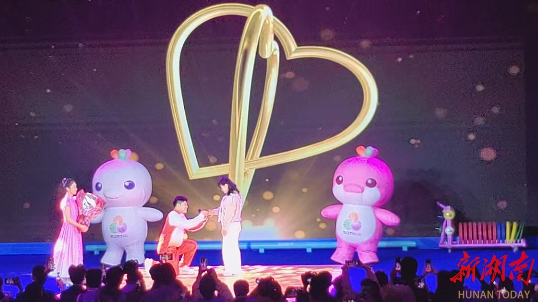 颁奖结束后,观众正准备离场时,举重台上的大屏幕突然出现极具浪漫的图案,随着音乐声的响起,刘焕华走到台中央。“下面,让我们共同见证刘焕华人生另一个重要时刻。”主持人话音落下,刘焕华走下举重台,牵着一位姑娘的手来到台中央,单膝下跪,拿出早已准备好的钻戒对姑娘说:“这些年来,你陪我熬过艰难时刻,今天我想给你一个家,嫁给我好吗。”“我愿意。”姑娘哽咽应允。刘焕华一手抱着未婚妻,一手高举全运金牌,镜头定格下这“冠军与爱情双丰收”的动人画面。全场欢呼,为这对新人送上最美好的祝福。