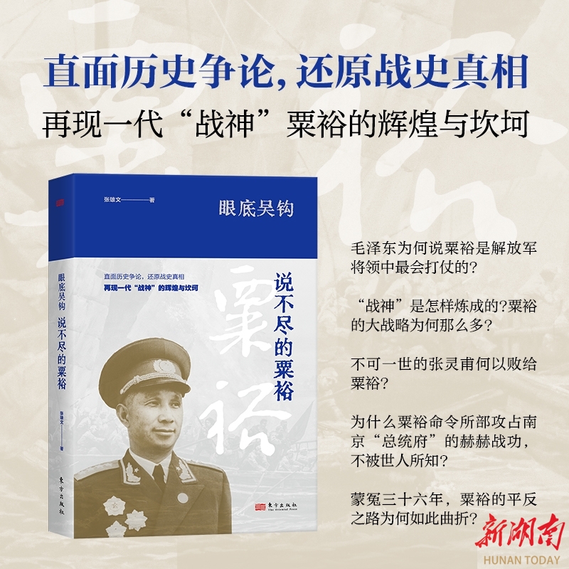 湖南日报·新湖南客户端11月20日讯(通讯员 黄明)近日,张雄文长篇纪实文学作品《眼底吴钩:说不尽的粟裕》由东方出版社再版,全国新华书店发行。该书原出版于2016年10月,先后5次加印,深受读者特别是军史爱好者喜爱。该书是张雄文七部粟裕专著之一,也是其数十年间粟裕研究的集大成之作,主要针对关于开国第一将粟裕生平的一些争论而写就。作者以大量史料性的权威著述为参考,攫取粟裕人生的精彩传奇片段,从战争岁月的金戈铁马、谈兵论战,到和平年代的人事纠葛、含冤忍辱;分战事、人事、威望、战绩、蒙冤、战史、战友、部下八个部分,篇章独立又互相呼应,爬梳辨伪,探幽发微,回顾了粟裕大将无比辉煌的功绩,解开了战史军史上的诸多未解之谜,揭露了他跌宕起伏的人生背后的历史隐情,呈现出一个更为真实的粟裕。