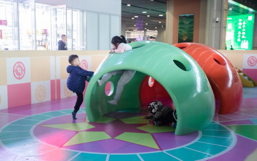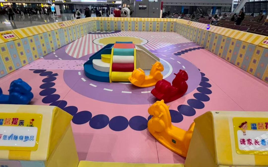 位于北京站二楼环马廊北侧的儿童娱乐区内,地面上色彩分明的软垫,仿佛是一块柔软的梦幻之地,孩子们清脆的笑声让原本枯燥的候车时光充满乐趣。