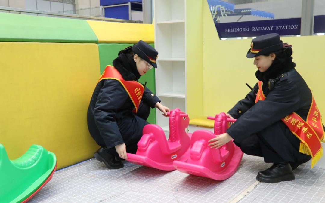 北京丰台站儿童娱乐区位于候车区东南侧,区域用软体墙与候车区隔离,儿童可以尽情在里面肆意撒欢儿。同时,更换全新玩具和柔软地垫,新增儿童攀爬架、毛毛虫钻洞设施,满足不同年龄段孩子的玩乐需求。“这个儿童娱乐区真不错,孩子在里面玩得特别开心,我们带娃也更轻松,旅程变得更省心。”旅客王女士说。