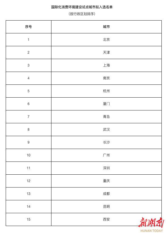 湖南日报11月20日讯(全媒体记者 彭可心 通讯员 张埕)记者今天从商务部官网获悉,根据《财政部 商务部关于开展国际化消费环境建设工作的通知》(财建〔2025〕342号)要求,商务部、财政部于近期组织开展了国际化消费环境建设试点城市竞争性评审工作。根据评审结果,北京、天津、上海、长沙等15个城市拟纳入试点范围。
