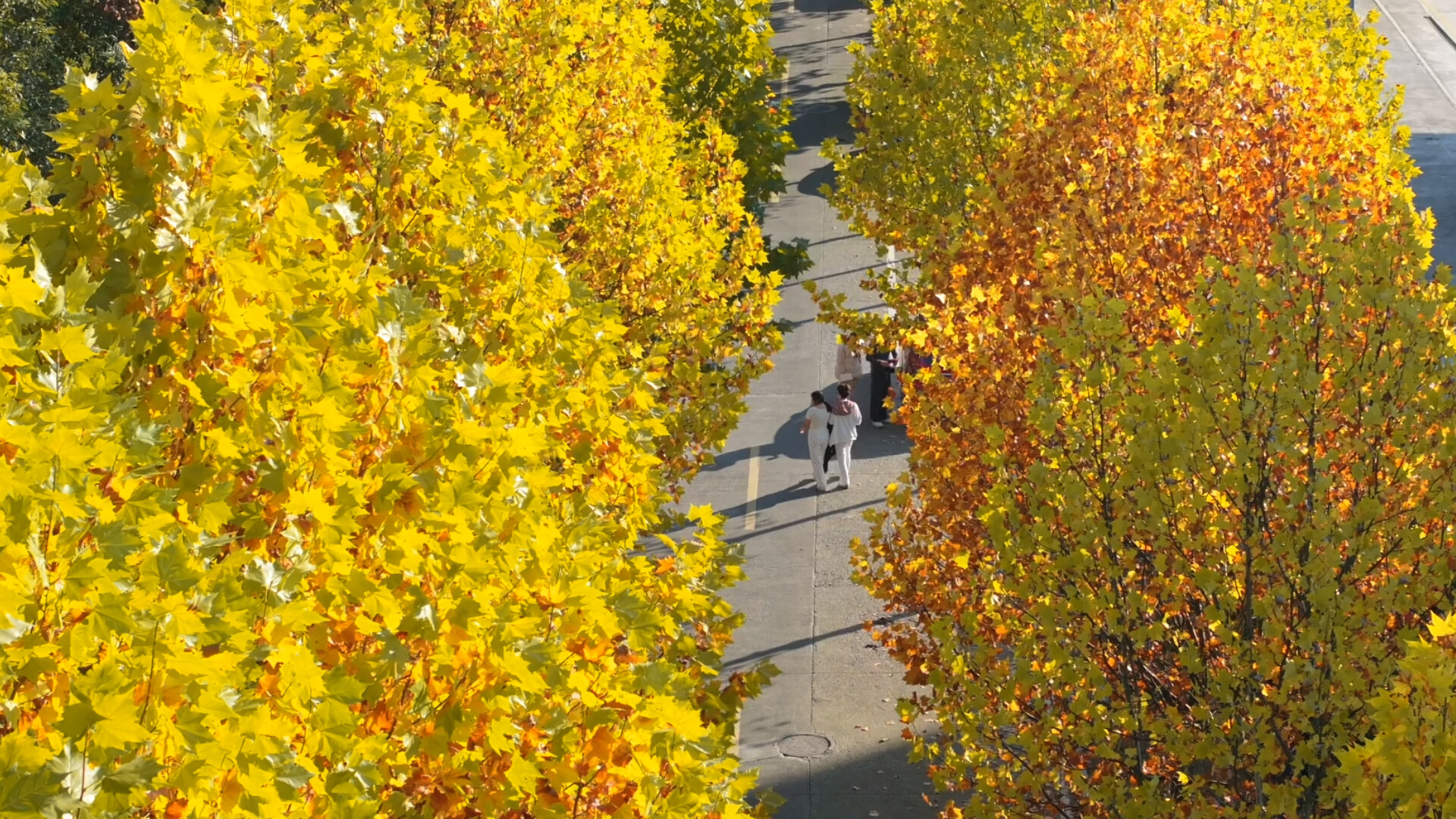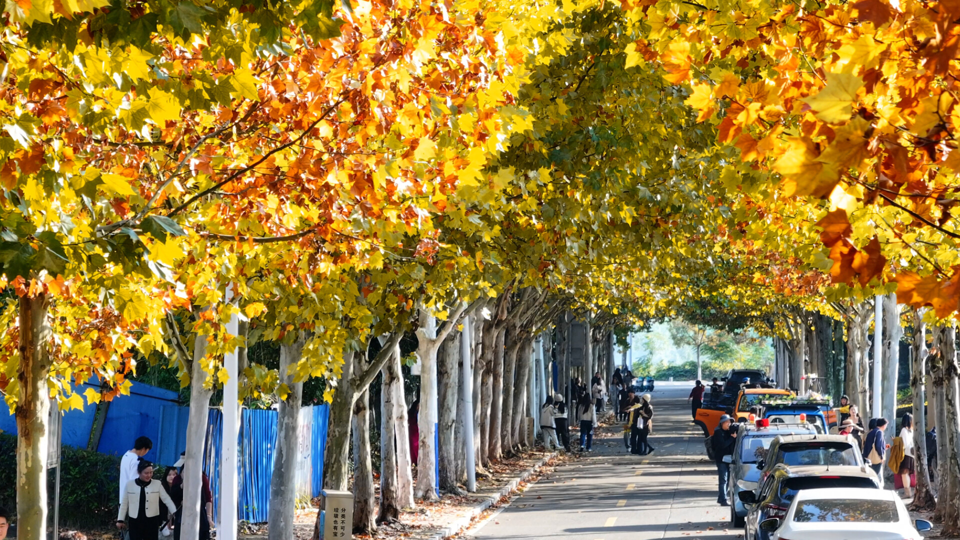 道路两旁的梧桐树褪去青绿,枝叶间渐染的金黄在阳光下愈发璀璨,微风拂过,金黄的叶片如蝴蝶般蹁跹飘落,在路面铺就出一层厚厚的“金色地毯”。