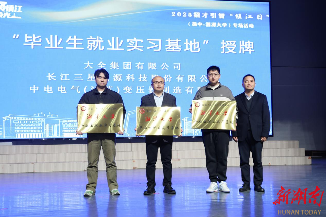 推介会上,湘潭大学为大全集团有限公司、长江三星能源科技股份有限公司、中电电器(江苏)变压器制造有限公司颁发“湘潭大学‘大学生就业实践基地’”匾牌;校地有关负责人共同为“湘潭大学‘镇江市高校人才工作站’”揭牌。