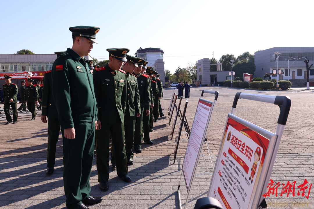 11月21日,武警官兵在观看消防安全知识宣传展板。当天,永州市消防救援支队走进驻地武警支队,共同开展“消防安全进军营”主题活动。通过理论授课与实操演练相结合的方式,为武警官兵送上了一堂内容充实、实用性强的消防安全“必修课”,增强武警官兵的消防安全意识和应急处置能力,进一步深化军地协同联动机制,共建平安警营,筑牢坚实防线。张娟 黄傲然 摄影报道(湖南图片库)