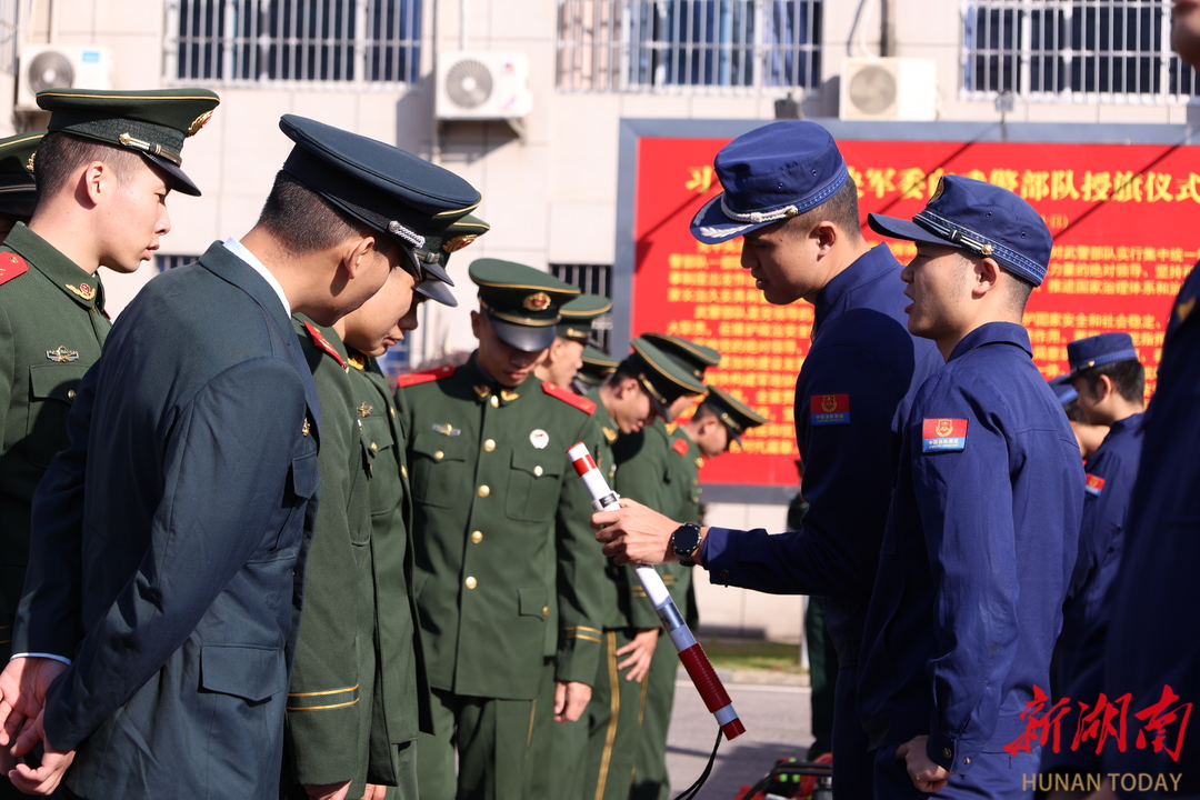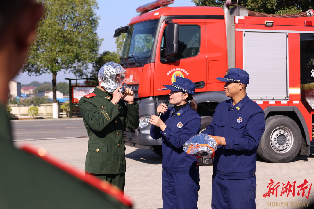 11月21日,消防宣传员现场指导官兵佩戴防毒面具要领。当天,永州市消防救援支队走进驻地武警支队,共同开展“消防安全进军营”主题活动。通过理论授课与实操演练相结合的方式,为武警官兵送上了一堂内容充实、实用性强的消防安全“必修课”,增强武警官兵的消防安全意识和应急处置能力,进一步深化军地协同联动机制,共建平安警营,筑牢坚实防线。张娟 黄傲然 摄影报道(湖南图片库)