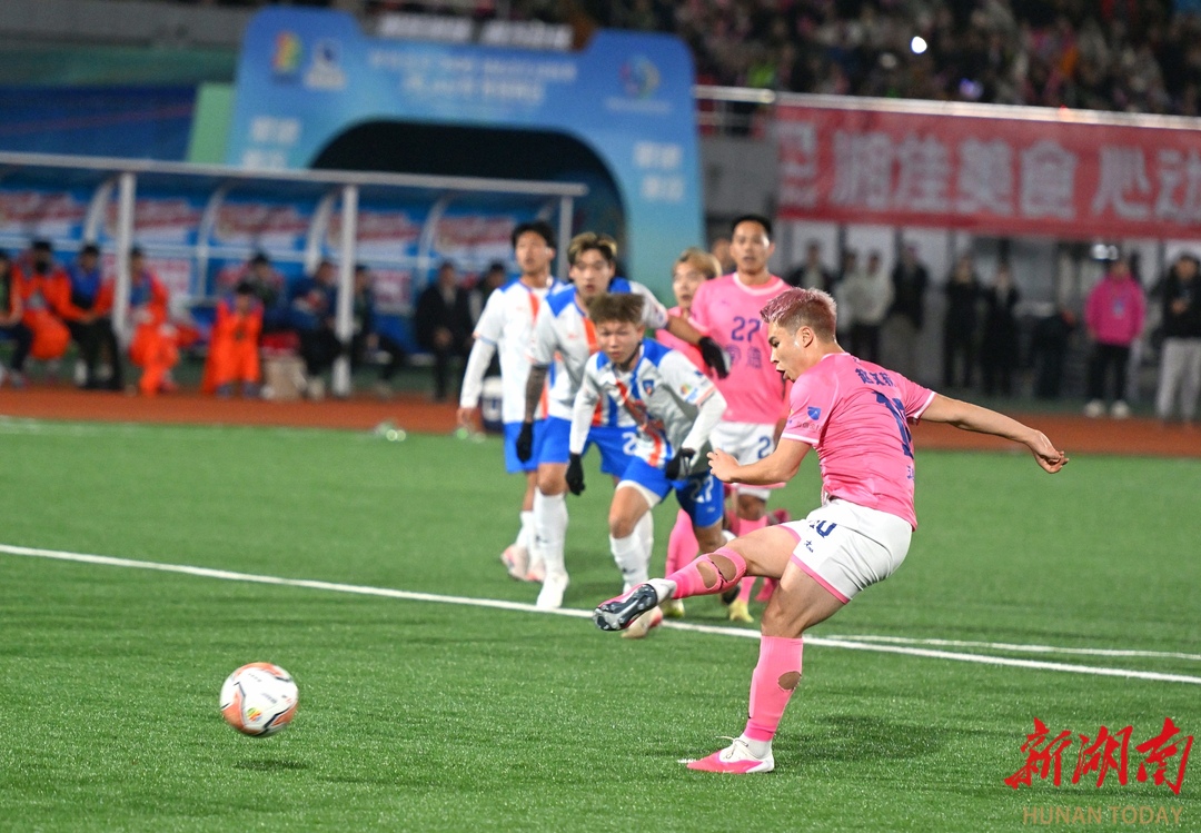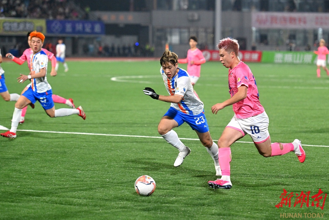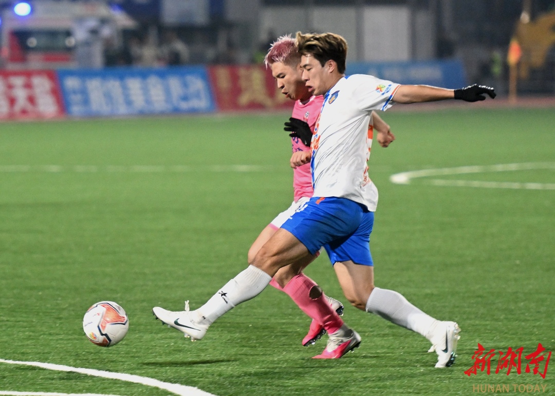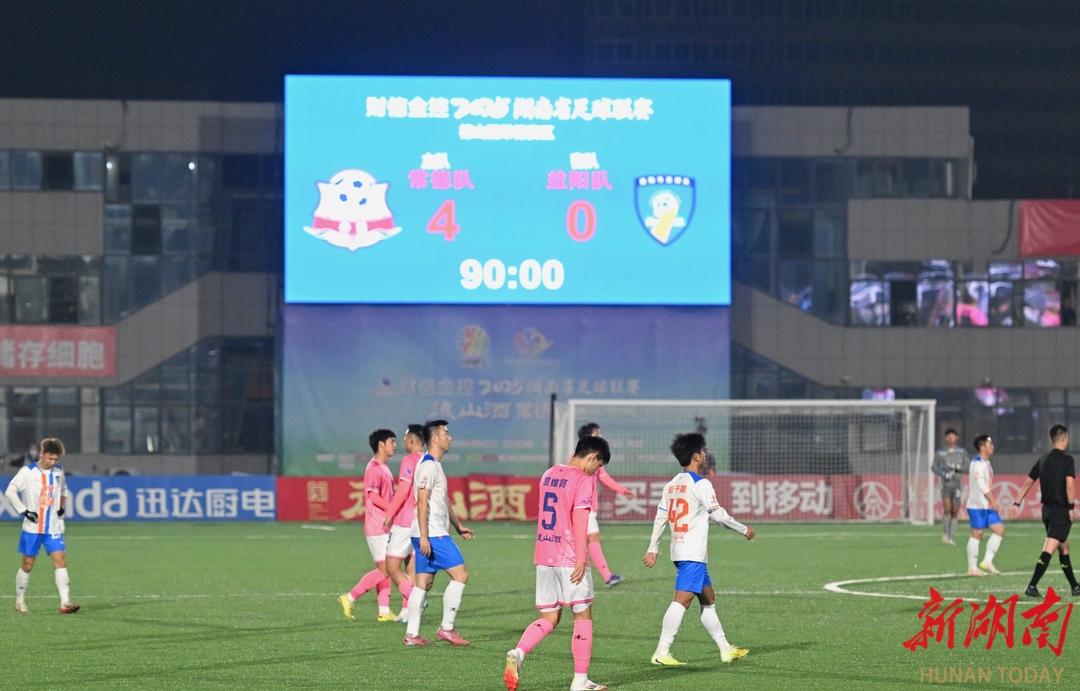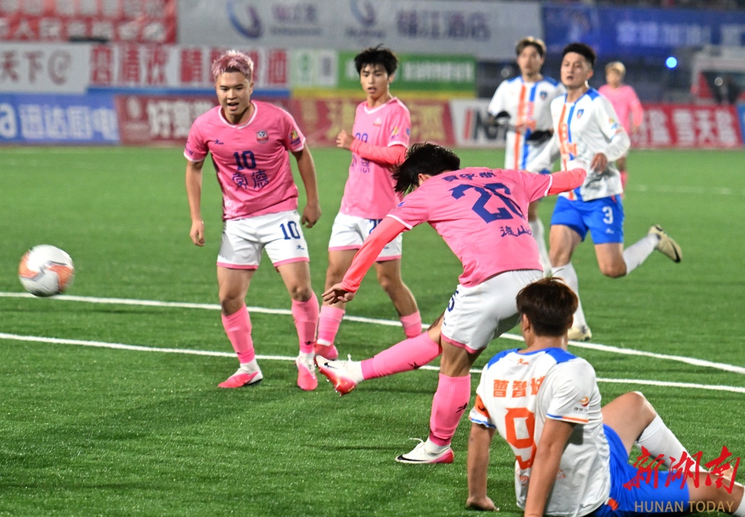 11月22日晚,湘超联赛第11轮,常德队在常德市体育运动中心主场对阵益阳队。最终,常德队以4比0战胜益阳队。湖南日报全媒体记者 郭立亮 摄