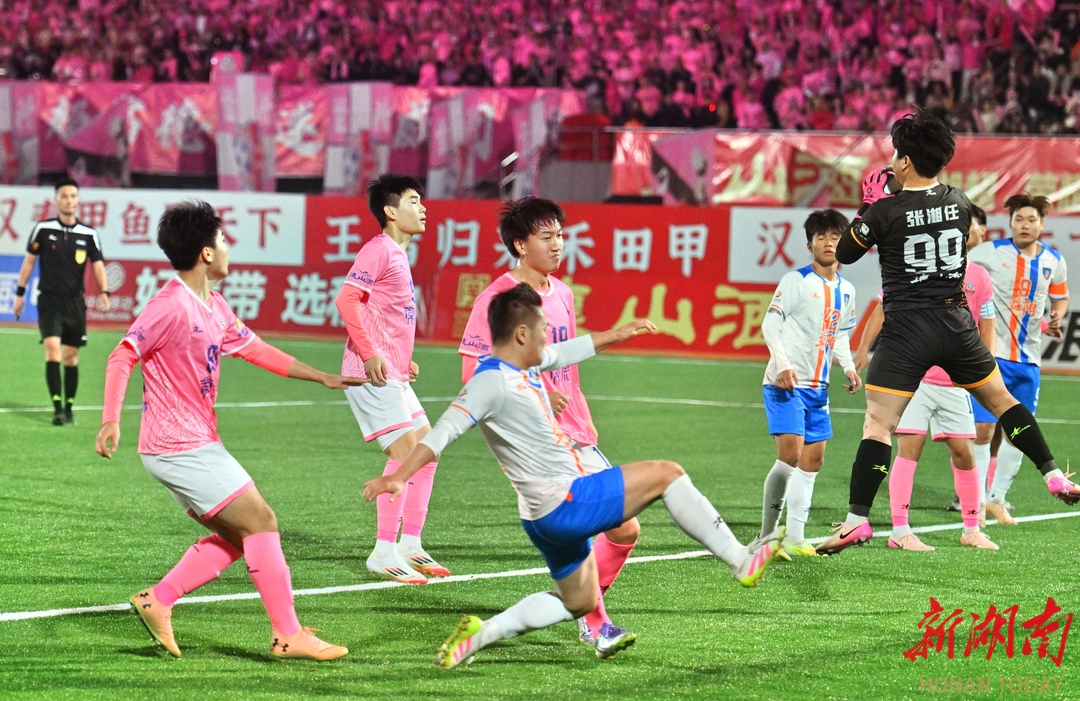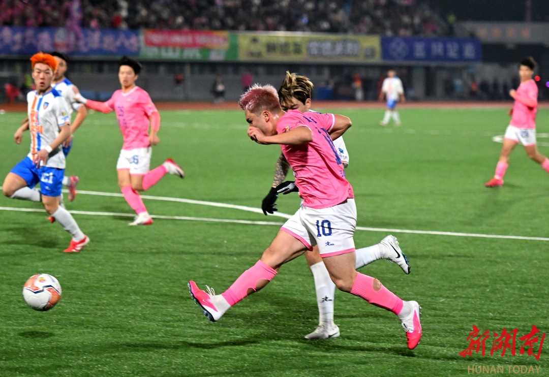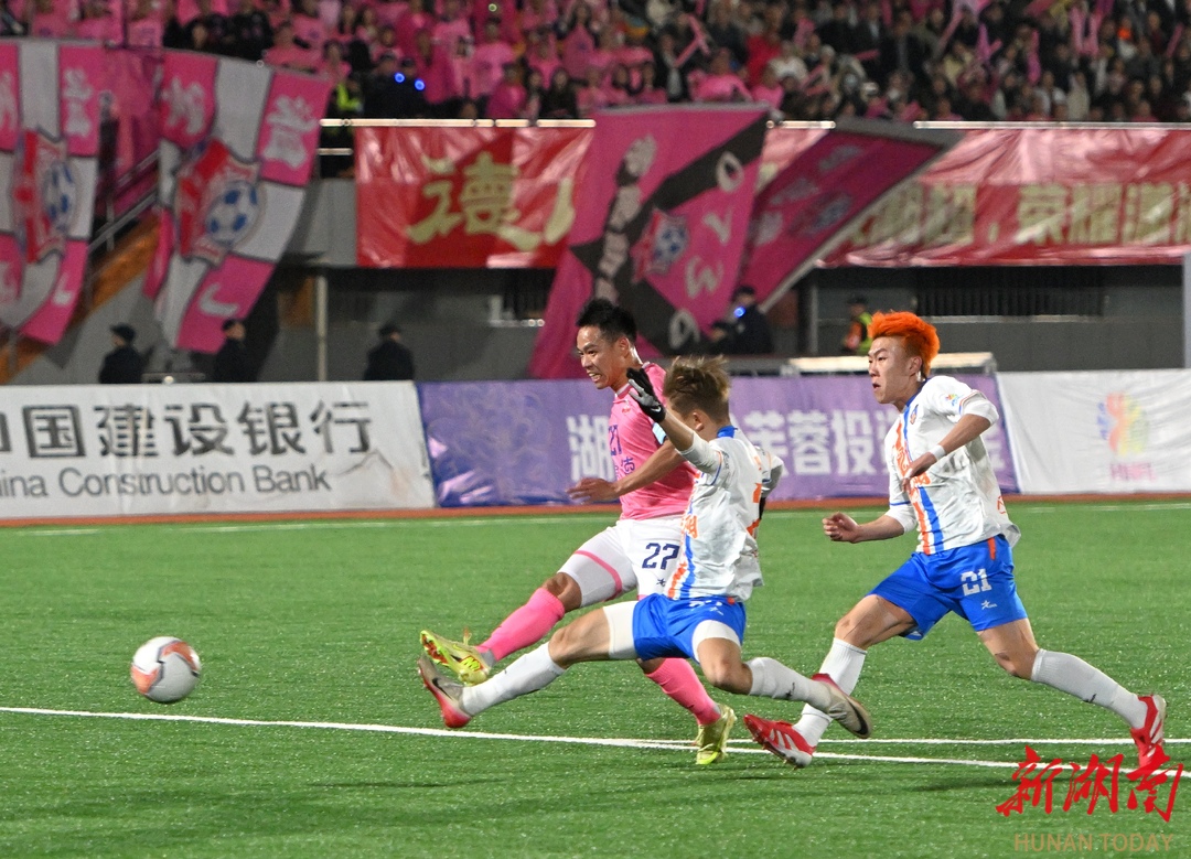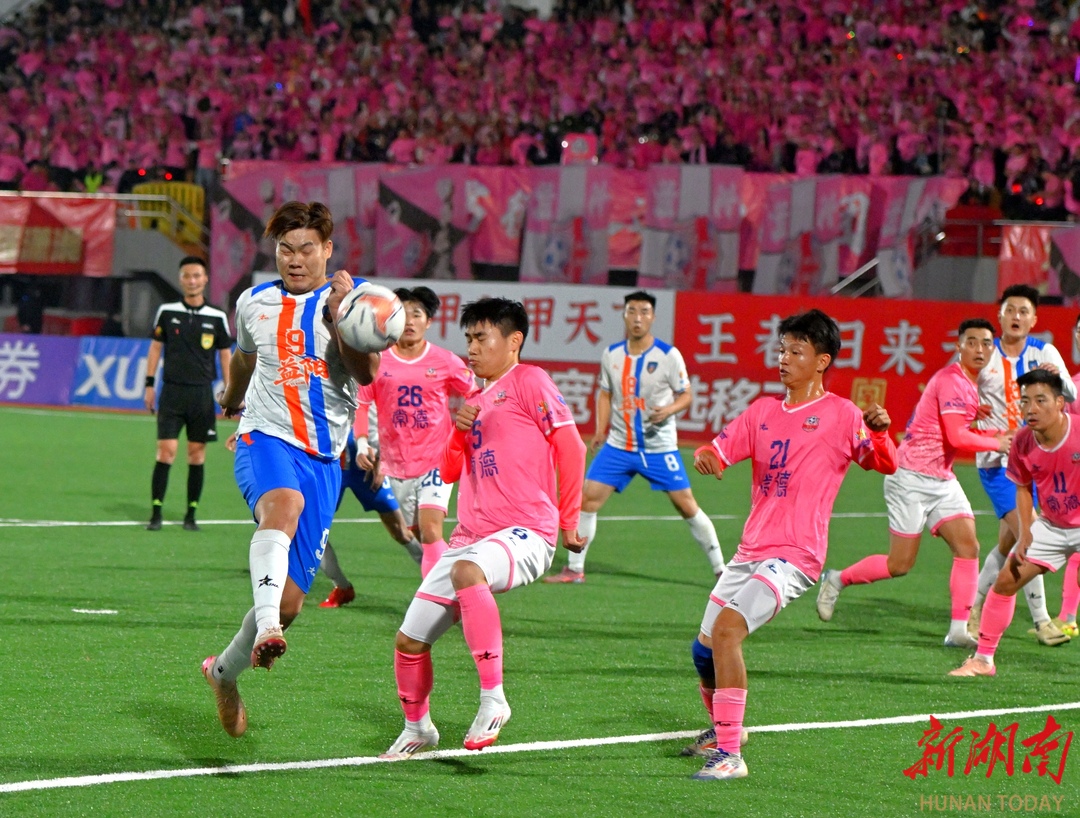 11月22日晚,湘超联赛第11轮,常德队在常德市体育运动中心主场对阵益阳队。最终,常德队以4比0战胜益阳队。湖南日报全媒体记者 郭立亮 摄