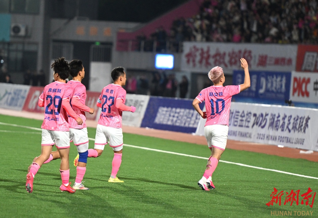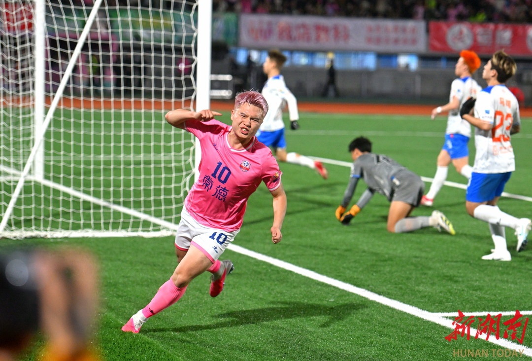 11月22日晚,球员在进球后庆祝。当天,湘超联赛第11轮,常德队在常德市体育运动中心主场对阵益阳队。最终,常德队以4比0战胜益阳队。湖南日报全媒体记者 郭立亮 摄