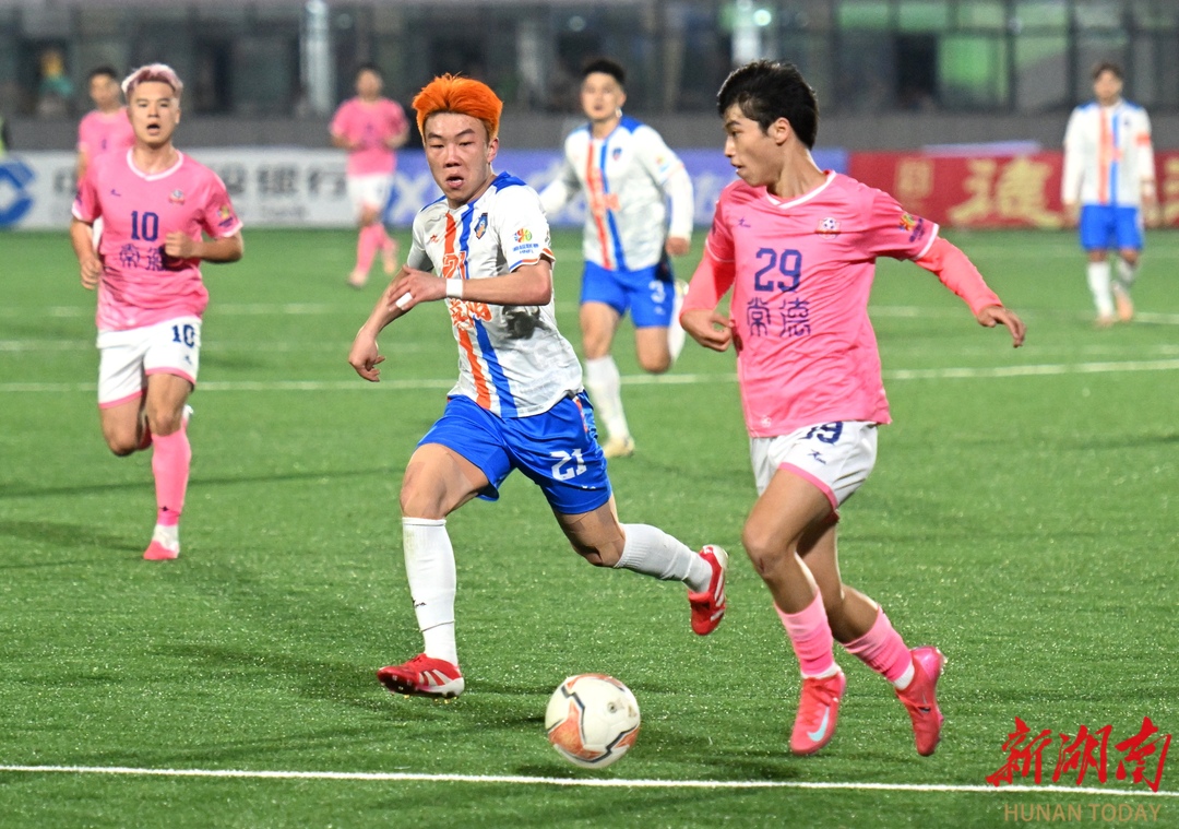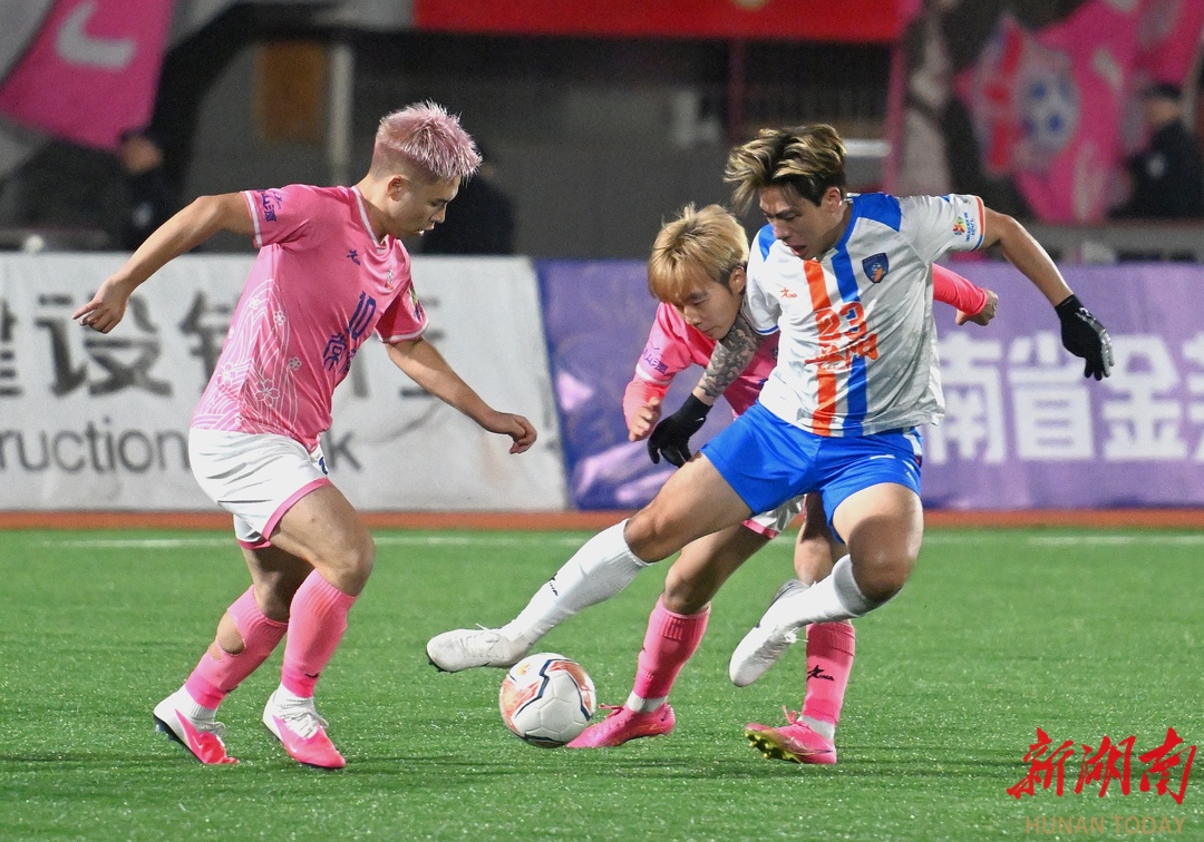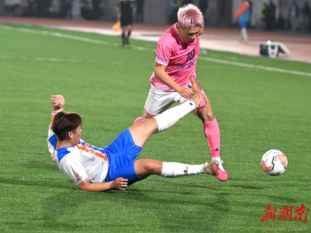 11月22日晚,双方球员在激烈拼抢中。当天,湘超联赛第11轮,常德队在常德市体育运动中心主场对阵益阳队。最终,常德队以4比0战胜益阳队。湖南日报全媒体记者 郭立亮 摄