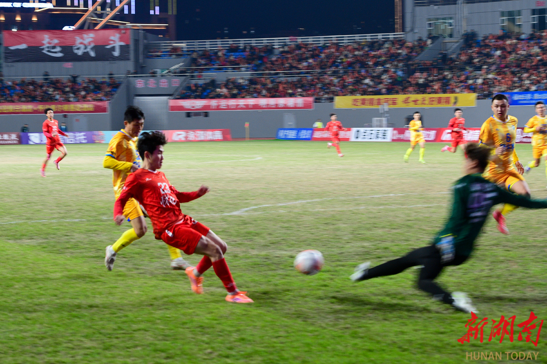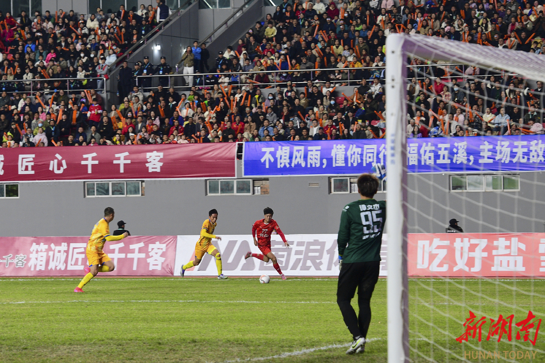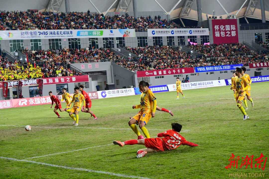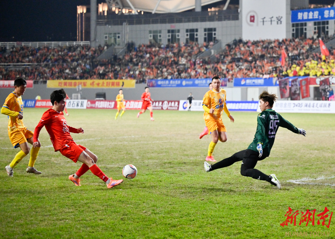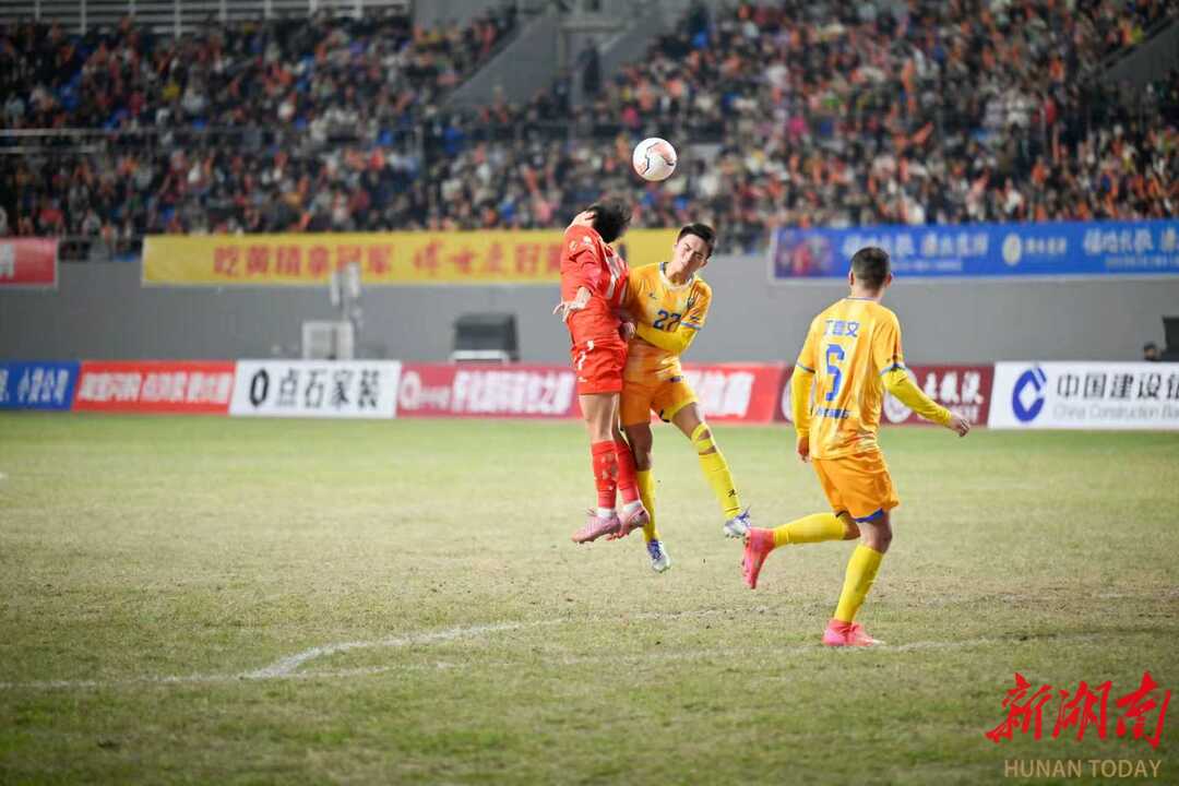 11月22日晚,怀化市体育中心,双方球员在比赛中激烈拼抢。当天,湘超联赛第十一轮比赛,怀化队主场迎战张家界队。最终,怀化队1比0战胜张家界队。潘雨 摄(湖南图片库)