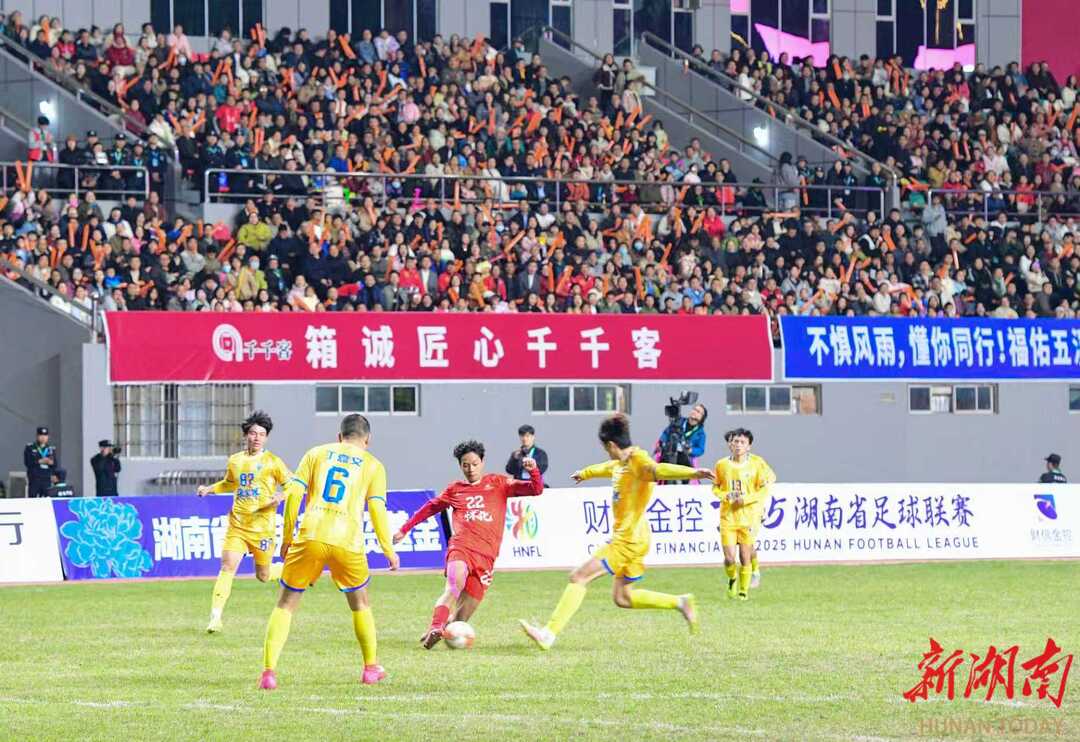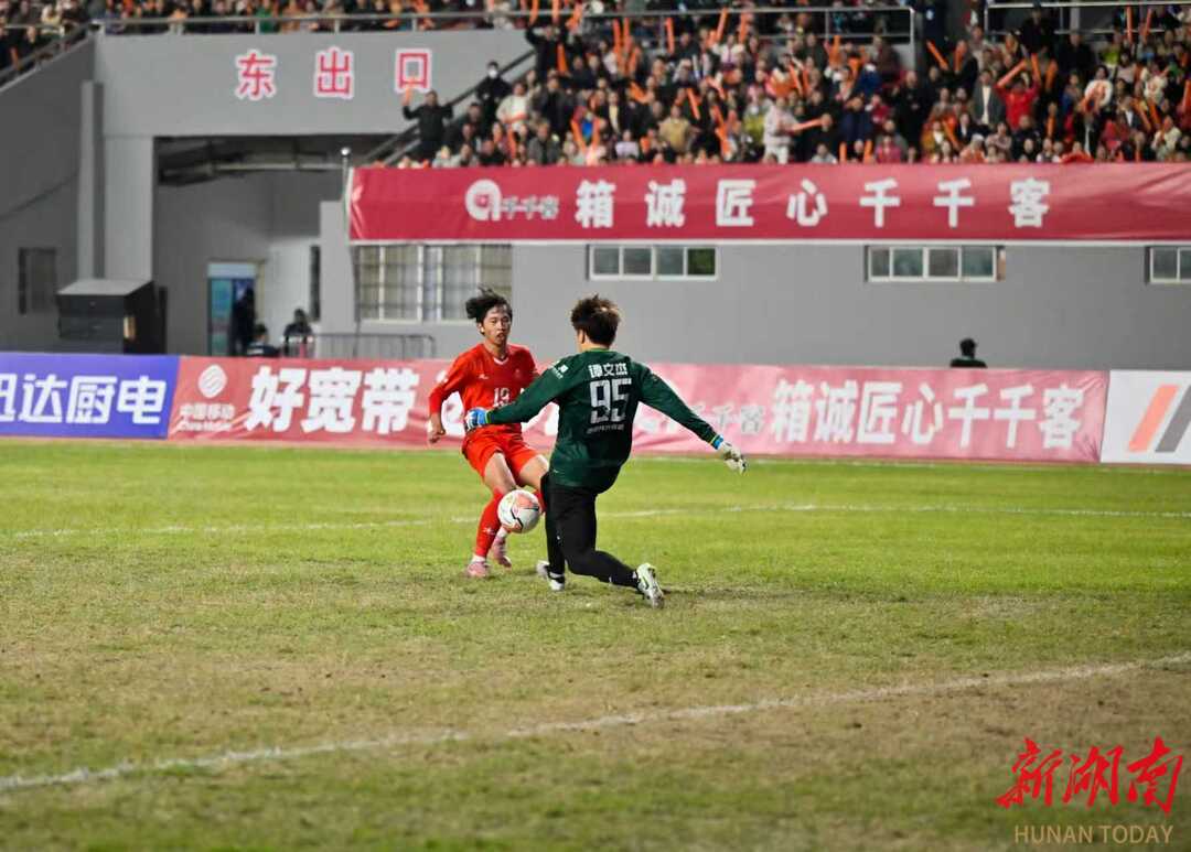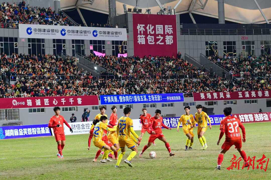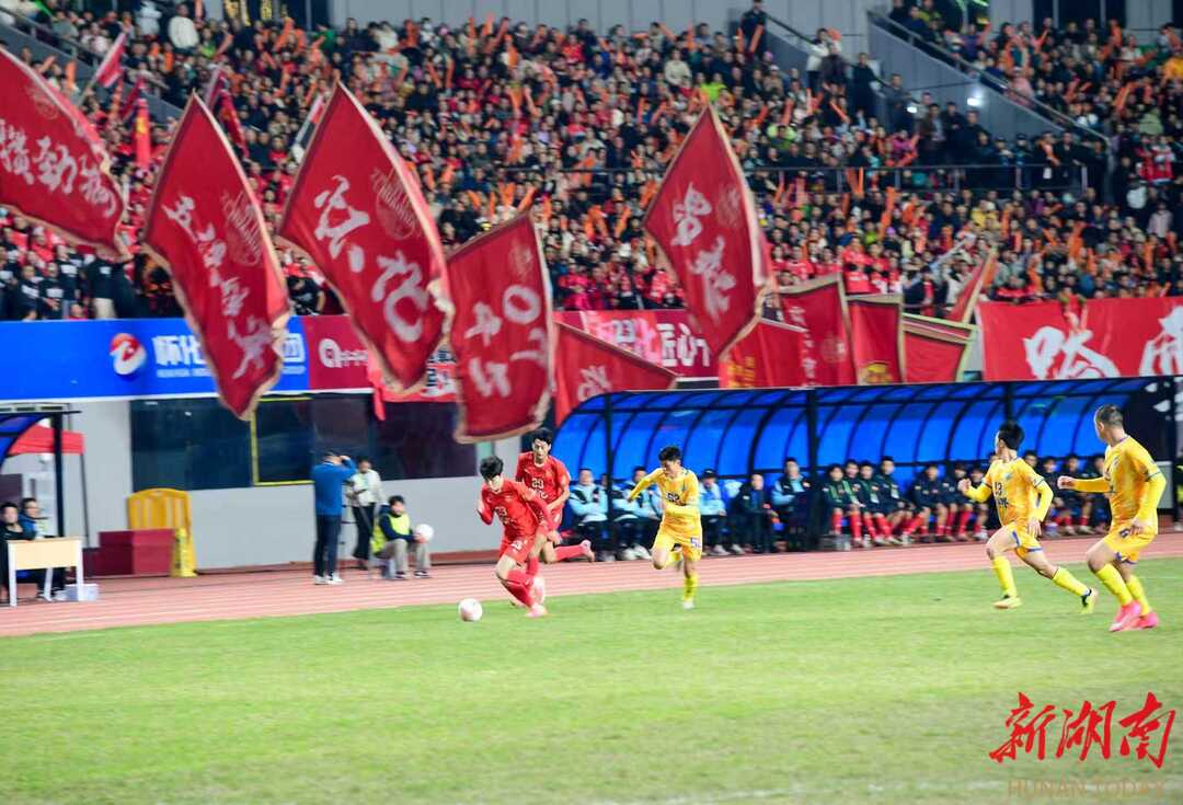 11月22日晚,怀化市体育中心,双方球员在比赛中激烈拼抢。当天,湘超联赛第十一轮比赛,怀化队主场迎战张家界队。最终,怀化队1比0战胜张家界队。潘雨 摄(湖南图片库)
