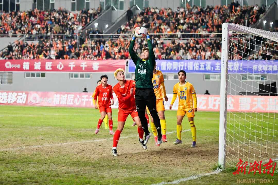 11月22日晚,怀化市体育中心,怀化队球员在进球后庆祝。当天,湘超联赛第十一轮比赛,怀化队主场迎战张家界队。最终,怀化队1比0战胜张家界队。周嘉晨 摄(湖南图片库)