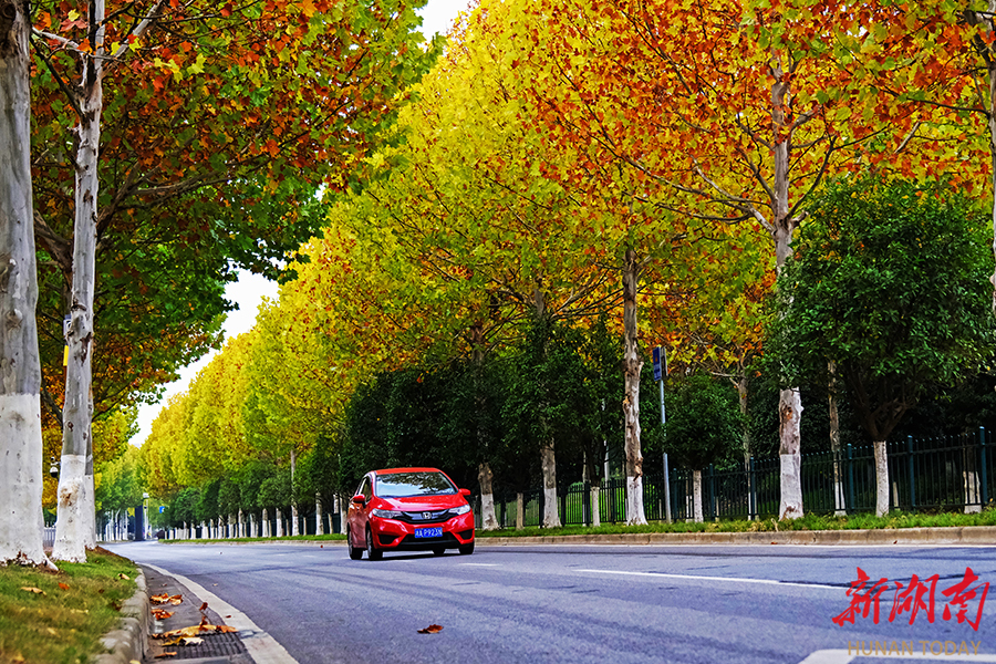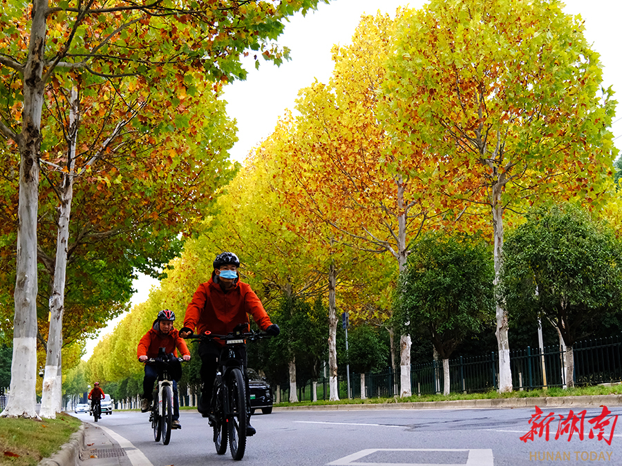 11月23日,长沙市芙蓉区滨河路,冬日暖阳下,道路两旁金黄的梧桐树叶为城市增添了一道亮丽的风景线。 林道辉 摄(湖南图片库)