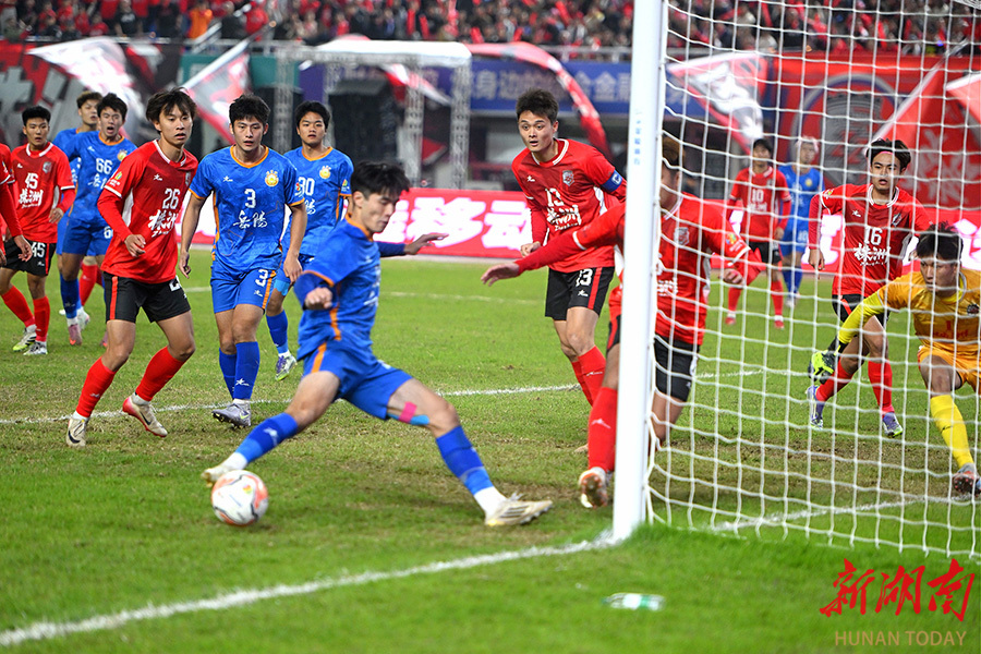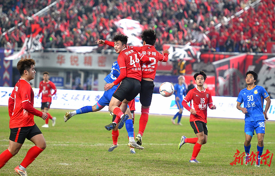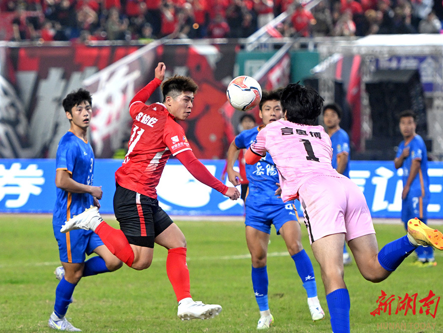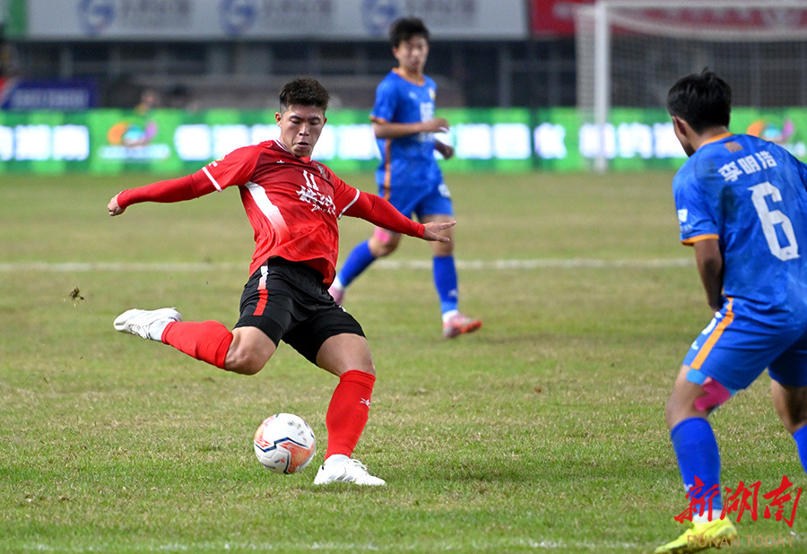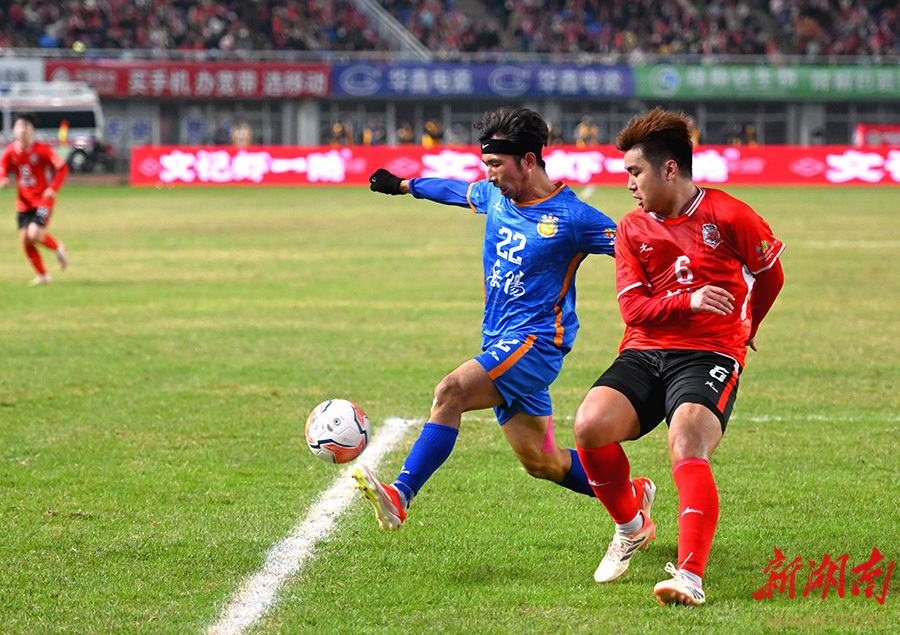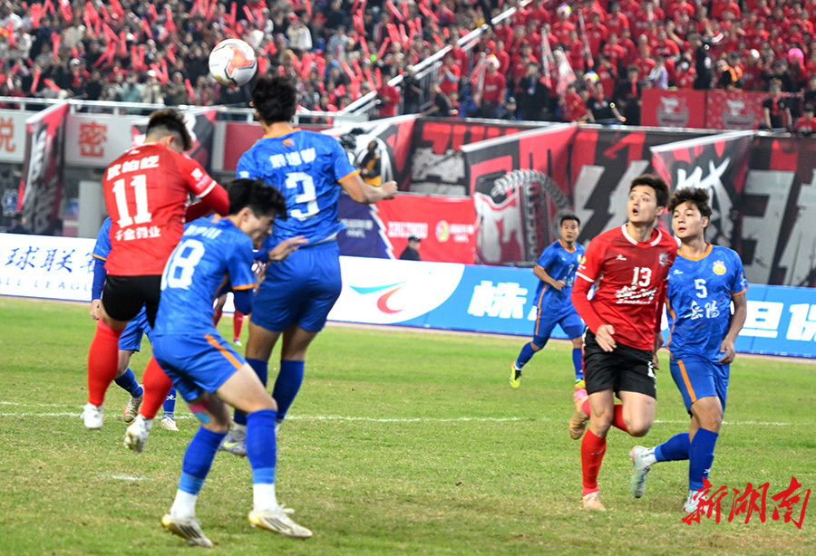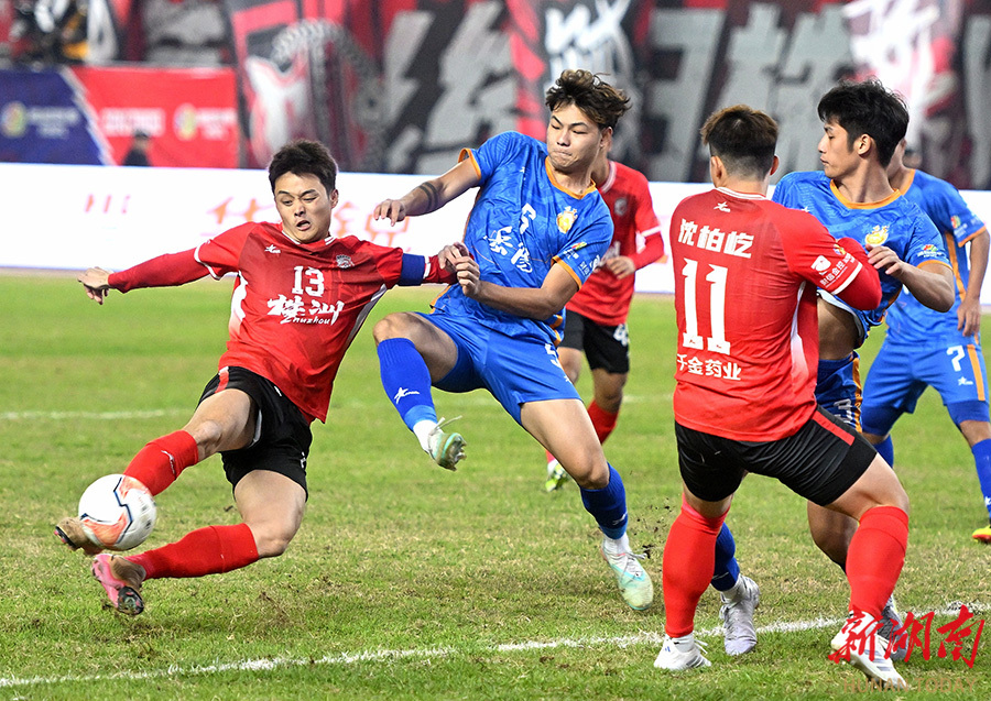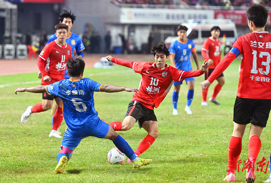 11月23日晚,双方球员在比赛中展开激烈拼抢。当天,湘超联赛第11轮,株洲队(红)在株洲体育中心主场对阵岳阳队。最终,株洲队以2比0战胜岳阳队。 湖南日报全媒体记者 郭立亮 摄