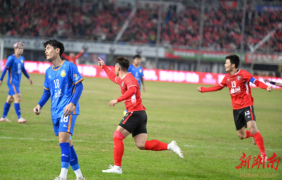 11月23日晚,株洲队队员在加油庆祝。当天,湘超联赛第11轮,株洲队(红)在株洲体育中心主场对阵岳阳队。最终,株洲队以2比0战胜岳阳队。 湖南日报全媒体记者 郭立亮 摄