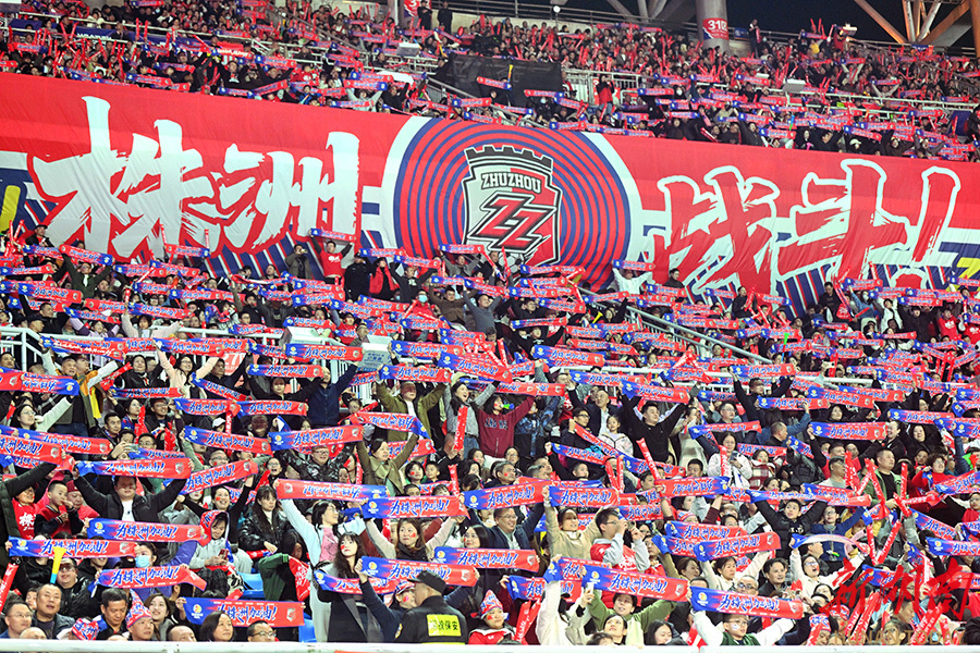 11月23日晚,观众在加油呐喊。当天,湘超联赛第11轮,株洲队(红)在株洲体育中心主场对阵岳阳队。最终,株洲队以2比0战胜岳阳队。 湖南日报全媒体记者 郭立亮 摄