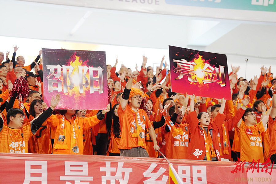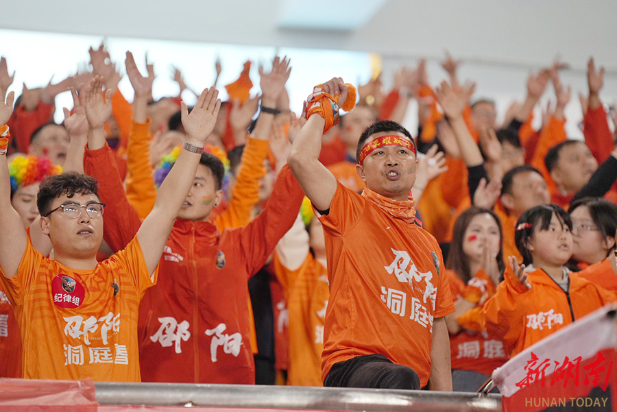 11月23日晚,球迷在加油呐喊。当天,2025“湘超联赛”第11轮,邵阳队(橙)主场对阵长沙队。最终,长沙队客场以1比0战胜邵阳队。申兴刚 摄(湖南图片库)