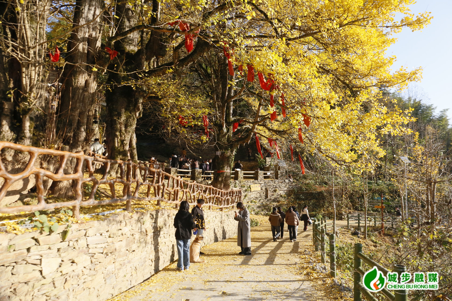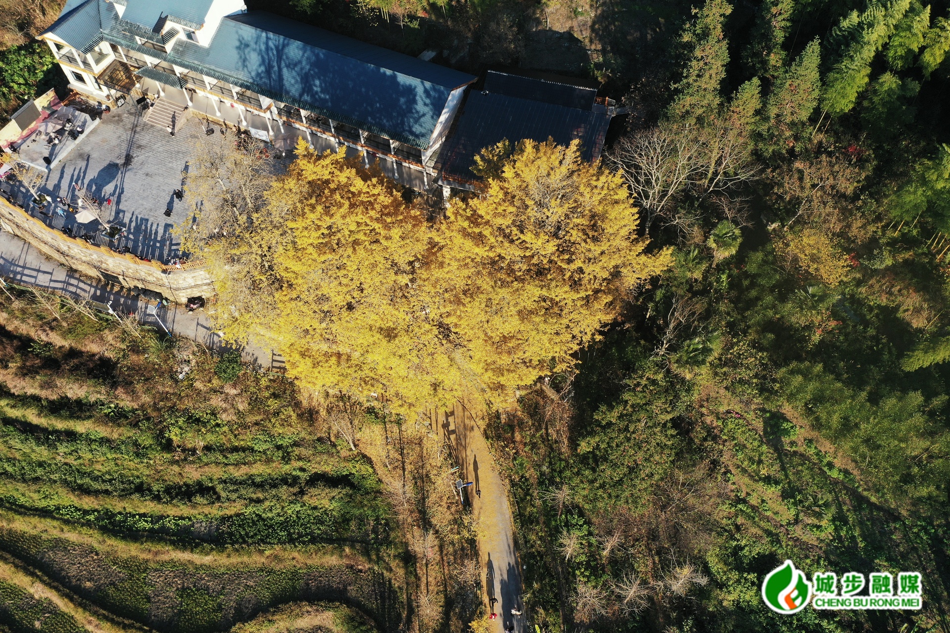 走近细看,古树树干粗壮挺拔,枝丫向天空肆意伸展,金黄叶片交织成天然华盖,微风拂过,银杏叶随风飘落,似金蝶蹁跹,在地面铺就柔软的金色地毯,成为山间一抹温暖明亮的风景。