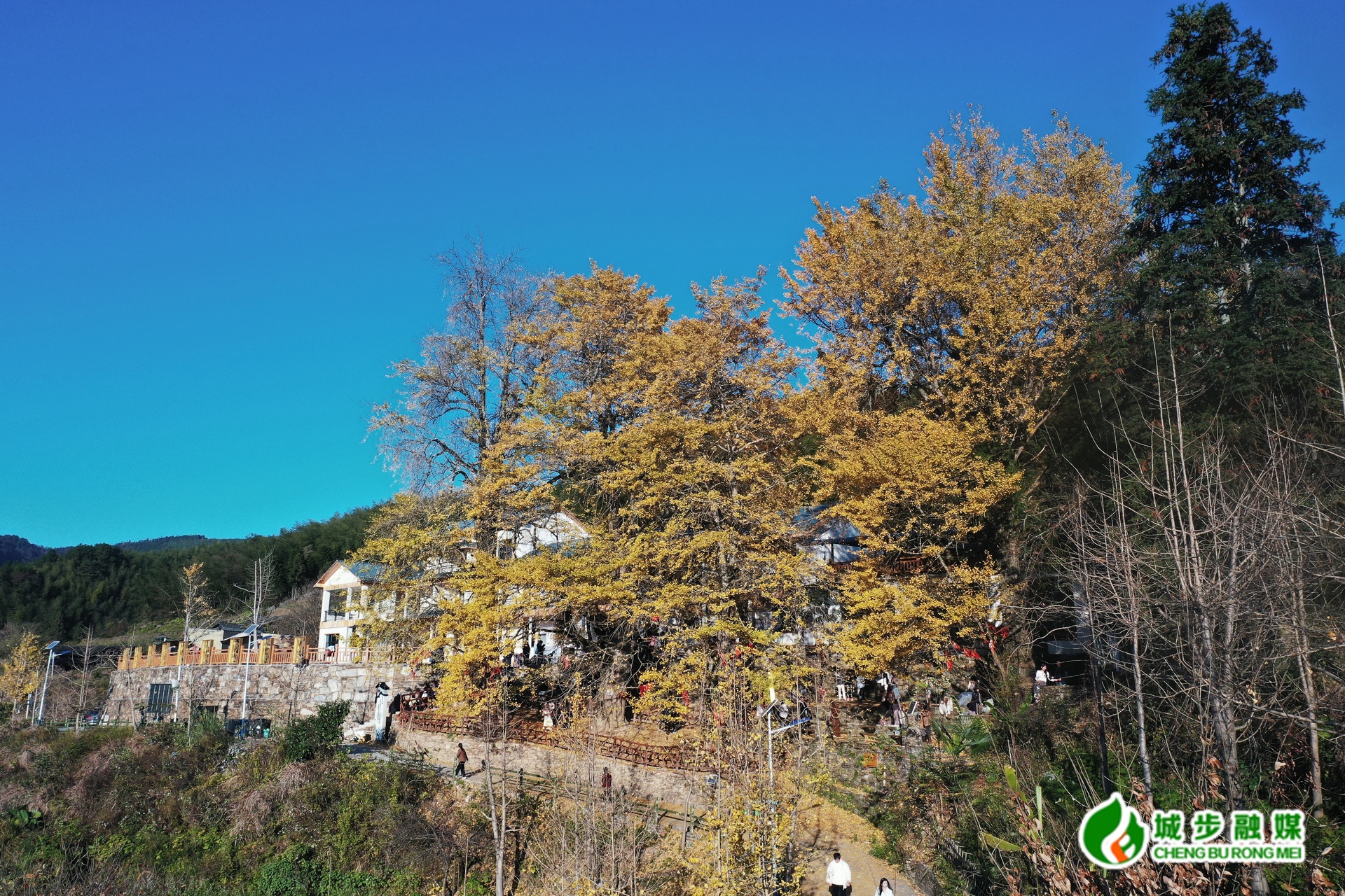 放眼望去,成片的银杏树在村落与山林间傲然挺立,金黄叶片在阳光下熠熠生辉,光线透过层层叠叠的枝叶洒落,投下斑驳光影,与村落的民宿、周边的山林相映成趣。