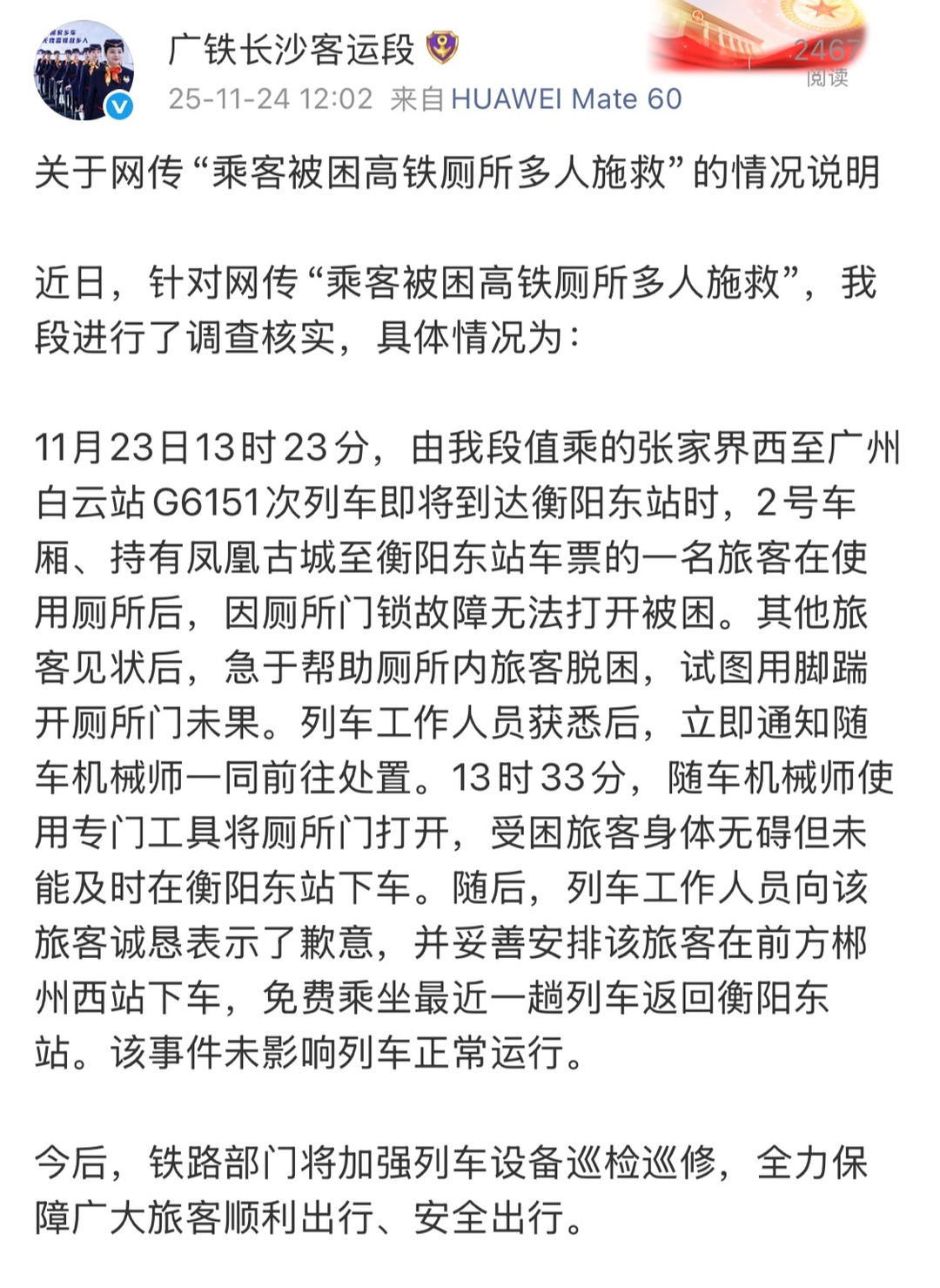 11月23日13时23分,由该段值乘的张家界西至广州白云站G6151次列车即将到达衡阳东站时,2号车厢、持有凤凰古城至衡阳东站车票的一名旅客在使用厕所后,因厕所门锁故障无法打开被困。其他旅客见状后,急于帮助厕所内旅客脱困,试图用脚踹开厕所门未果。列车工作人员获悉后,立即通知随车机械师一同前往处置。13时33分,随车机械师使用专门工具将厕所门打开,受困旅客身体无碍但未能及时在衡阳东站下车。随后,列车工作人员向该旅客诚恳表示了歉意,并妥善安排该旅客在前方郴州西站下车,免费乘坐最近后续列车返回衡阳东站。该事件未影响列车正常运行。