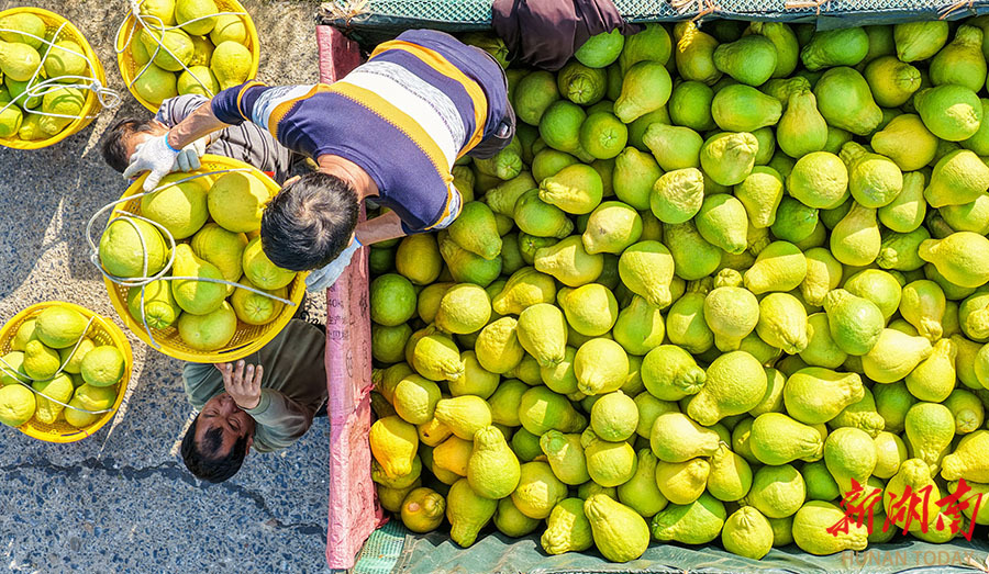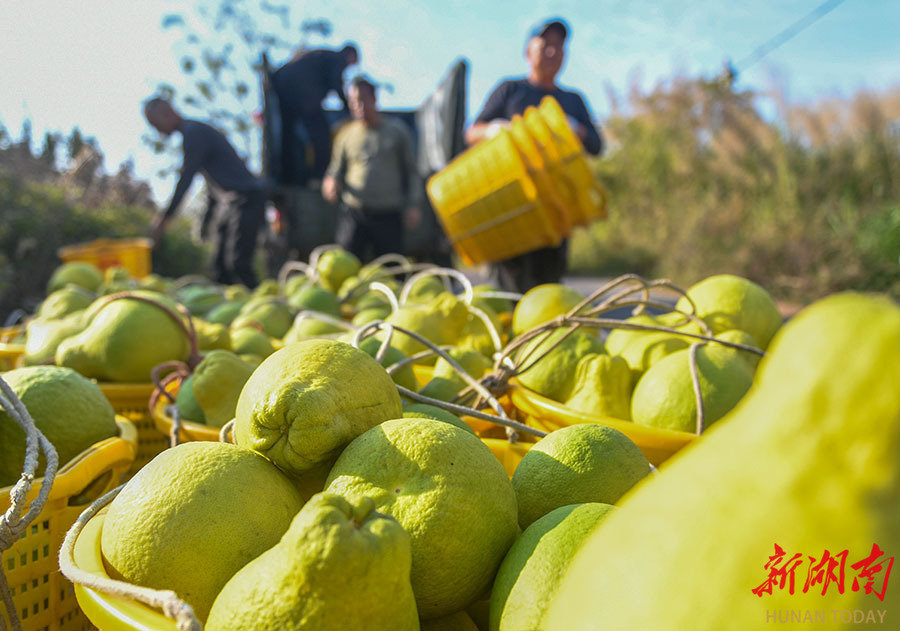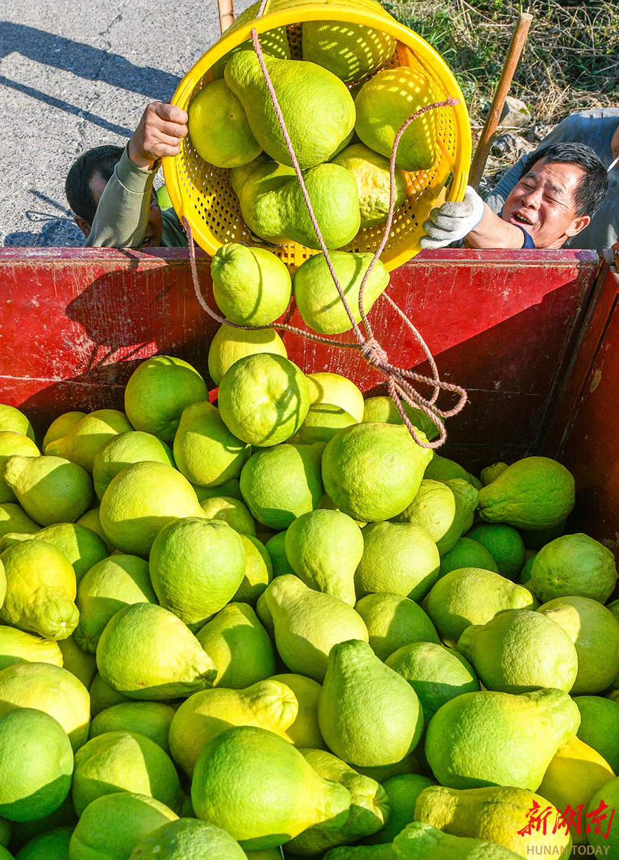 11月24日,道县梅花镇赤源村,三和希望生态农庄柚子种植基地的沙田柚喜获丰收,村民将柚子装车。近年来,当地通过“合作社+基地+农户”模式发展特色水果产业,有效促进农民增收。 蒋克青 摄(湖南图片库)