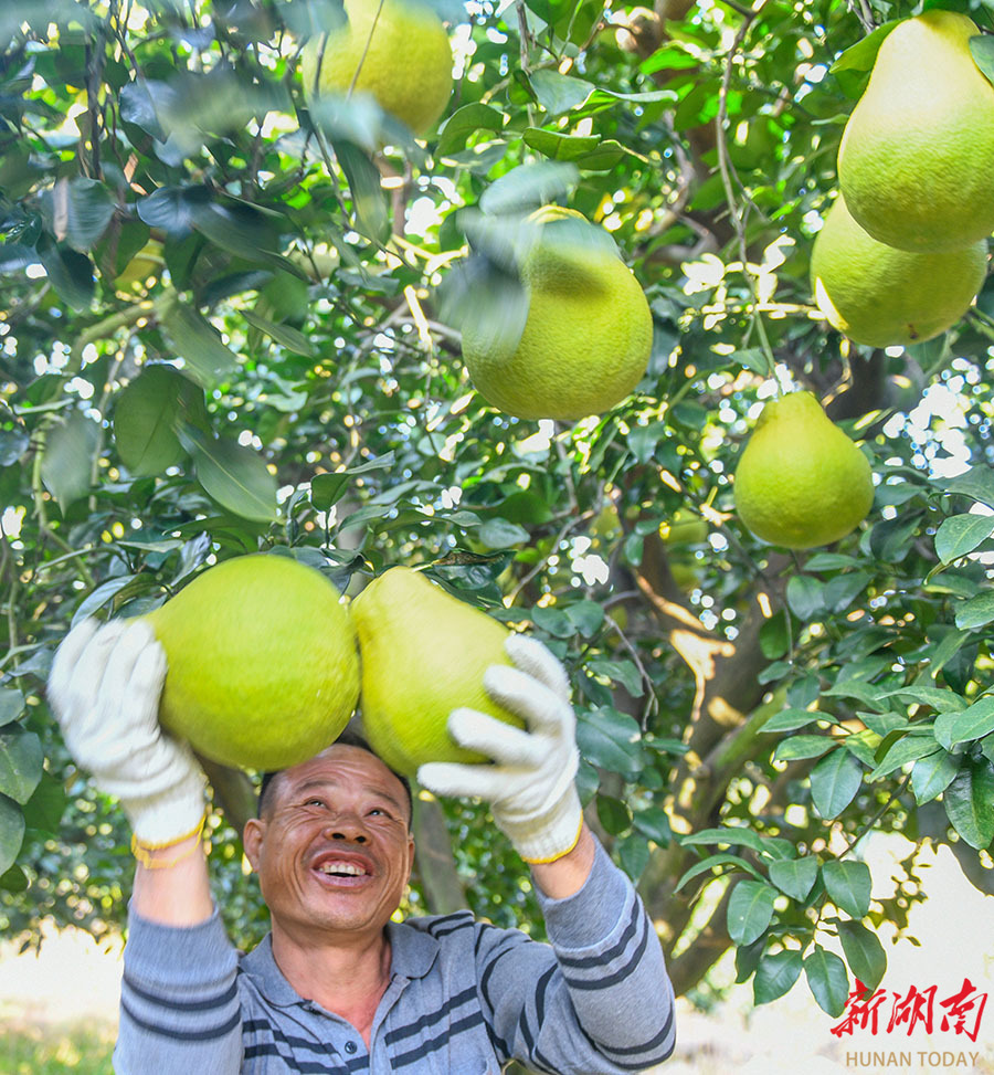 11月24日,道县梅花镇赤源村,三和希望生态农庄柚子种植基地的沙田柚喜获丰收,村民在采摘柚子。近年来,当地通过“合作社+基地+农户”模式发展特色水果产业,有效促进农民增收。 蒋克青 摄(湖南图片库)