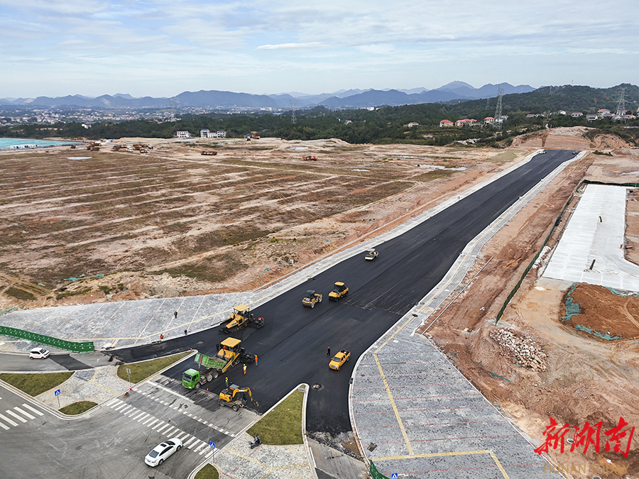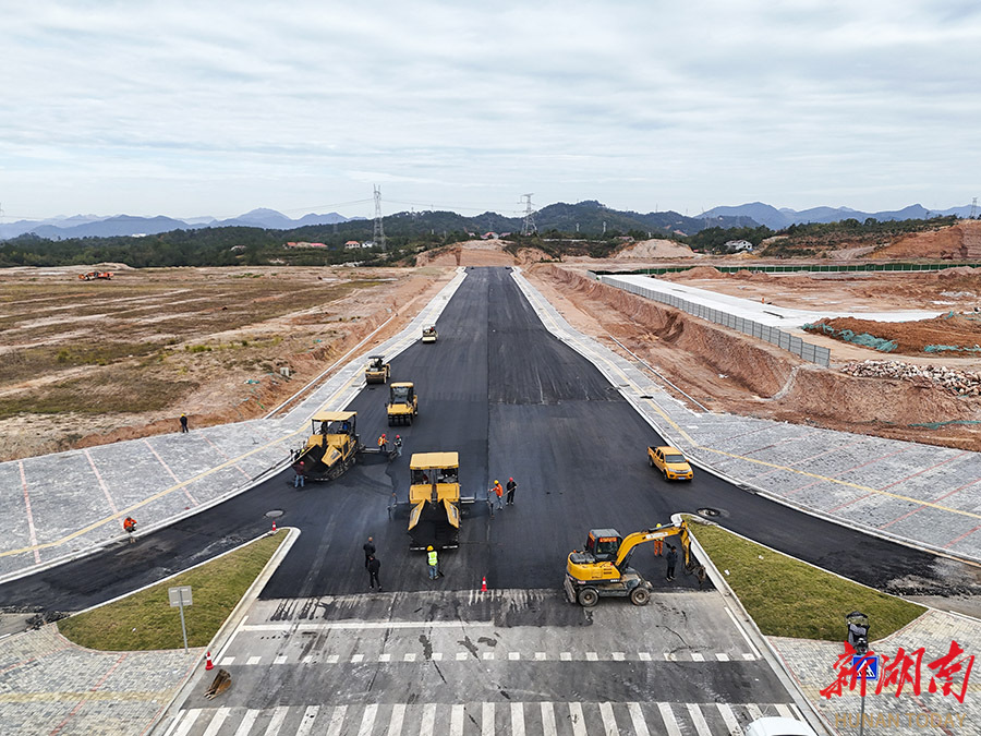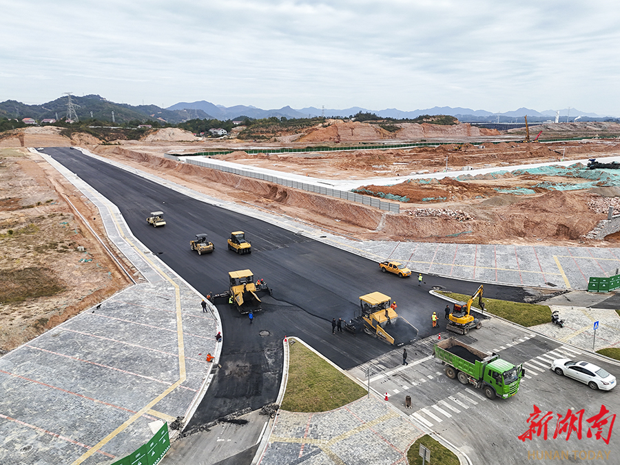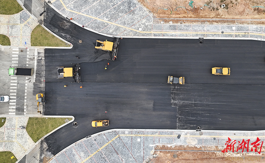 11月24日,娄底经开区工业园区创业二路,施工人员抢抓工期,沥青运输车、摊铺机、压路机等机械协同作业,确保项目按期高质量完工。 吴永华 摄(湖南图片库)