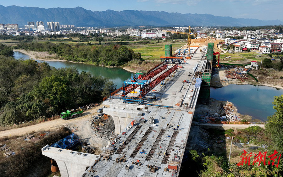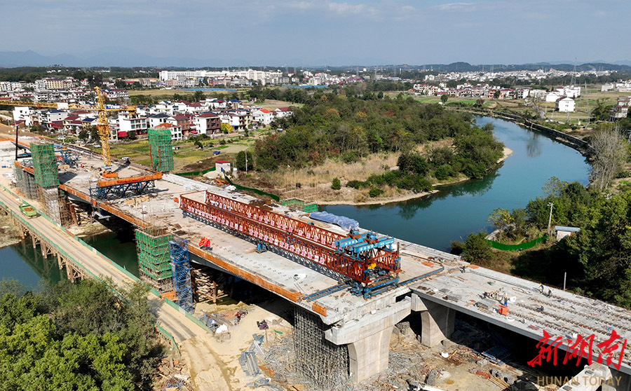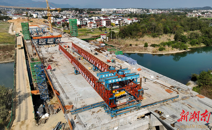 11月24日,洞口县平溪江大桥建设工地,工人在施工作业。连日来,长沙市市政工程有限公司施工人员抢抓晴好天气加快进度,确保年底通车,届时将显著改善沿线群众出行条件和经济发展环境。 滕治中 滕绍忻 摄影报道(湖南图片库)