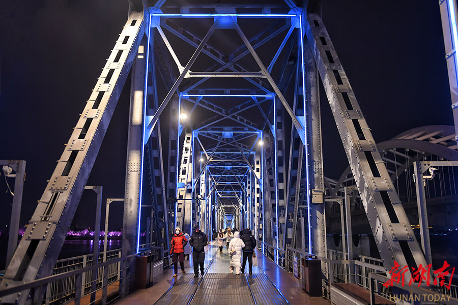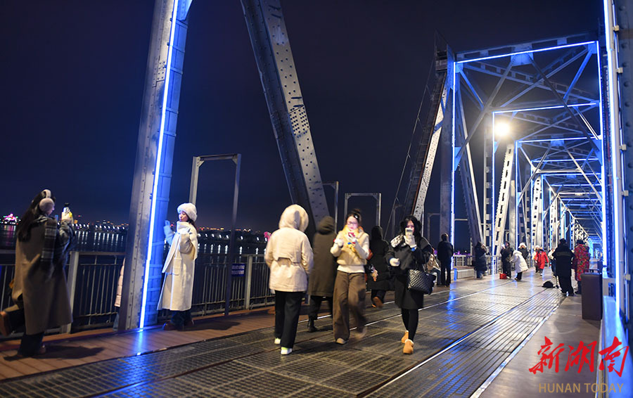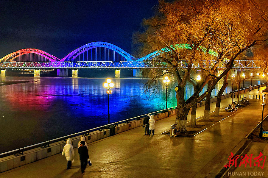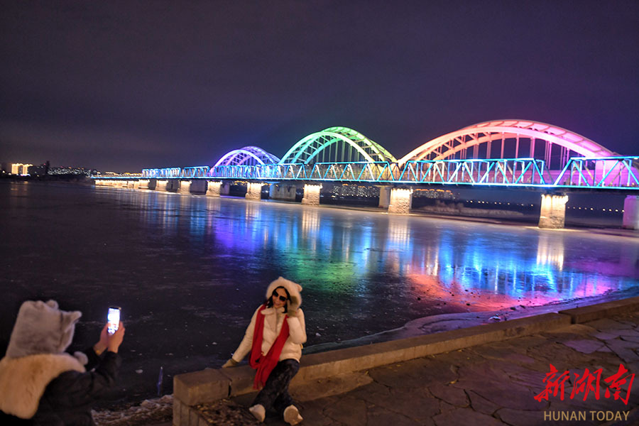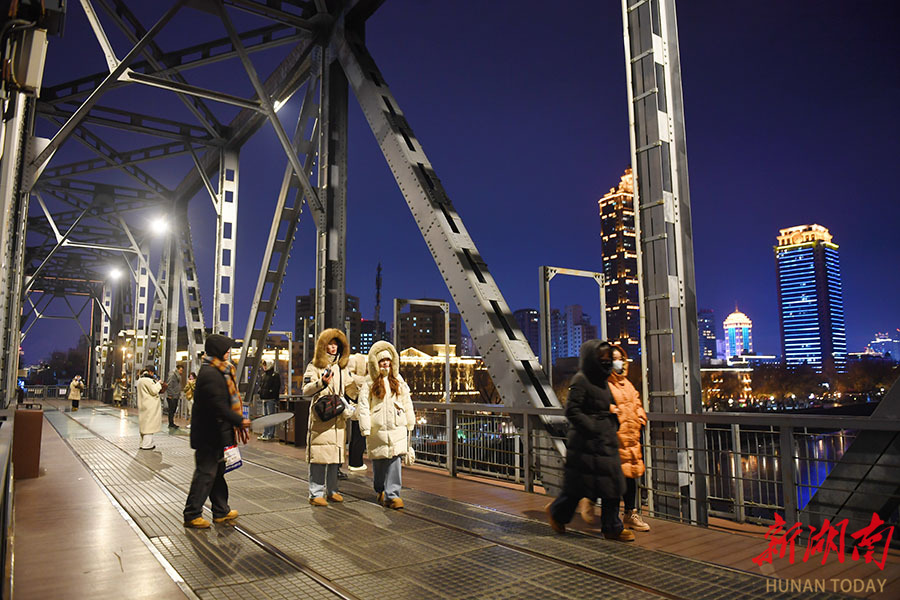 11月24日晚,黑龙江省哈尔滨市,游客在百年滨洲线松花江铁路大桥观光游览。这座始建于1900年、全长超千米的铁桥,见证了城市发展变迁,承载着哈尔滨人民的共同记忆。 湖南日报全媒体记者 徐行 摄