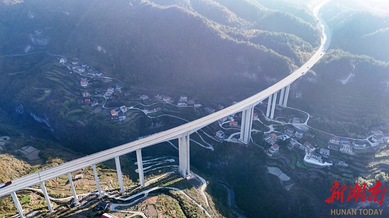 11月25日,新化县温塘镇,车辆行驶在龙(塘)琅(塘)高速温塘特大桥上。近年来,当地通过完善交通网络,探索“交通+农文旅”融合模式,方便群众出行,促进产业联动发展。 吴永华 摄(湖南图片库)
