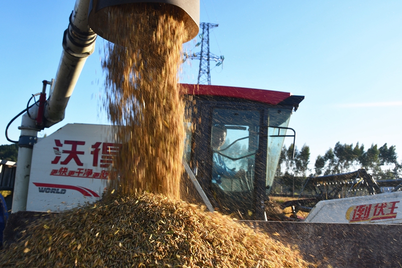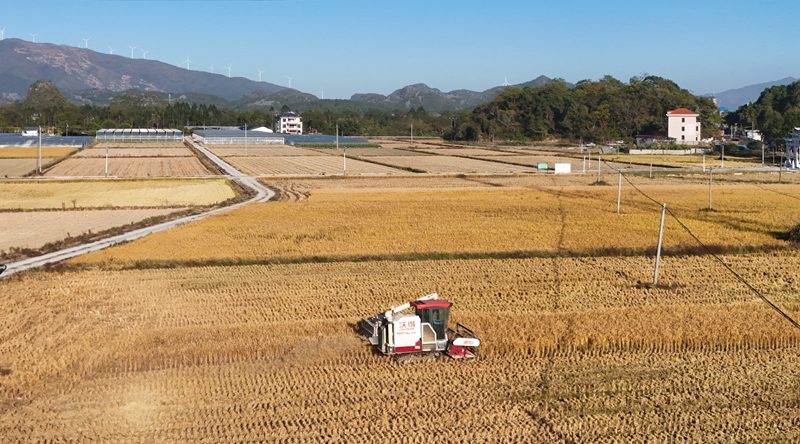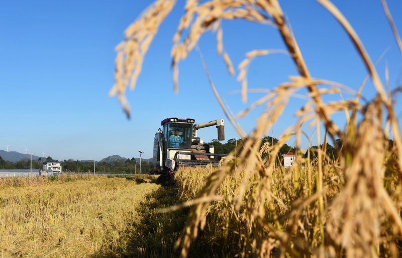 11月26日,江永县潇浦镇接龙桥村,农机手驾驶收割机收获晚稻。近期,该县14万亩晚稻收割进入尾声,农民抢抓晴好天气加紧收割、晾晒,确保颗粒归仓。 田如瑞 摄 (湖南图片库)