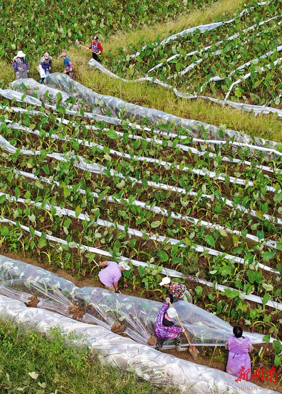11月26日,蓝山县毛俊镇西岭头村,村民在香芋田里覆盖保温膜。小雪节气过后,当地村民抢抓农时开展覆膜作业,有效防止霜冻危害,确保香芋安全越冬。近年来,该县采取“龙头企业+合作社+基地”模式,通过建设标准化种植基地、优化品种、统一技术标准等措施,发展香芋规模化种植3万余亩,不仅壮大了村集体经济,更拓宽了农民增收渠道。黄春涛 李梅 摄影报道(湖南图片库)