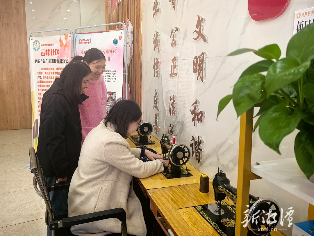 云峰社区的便民服务点内,志愿者帮居民缝补衣物。(吴珊 摄)