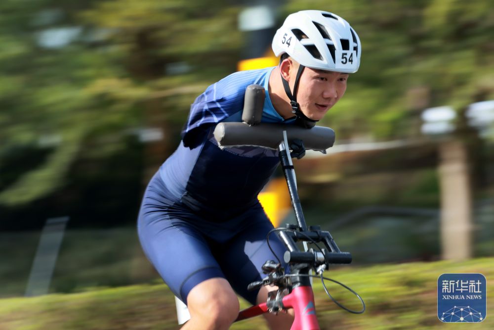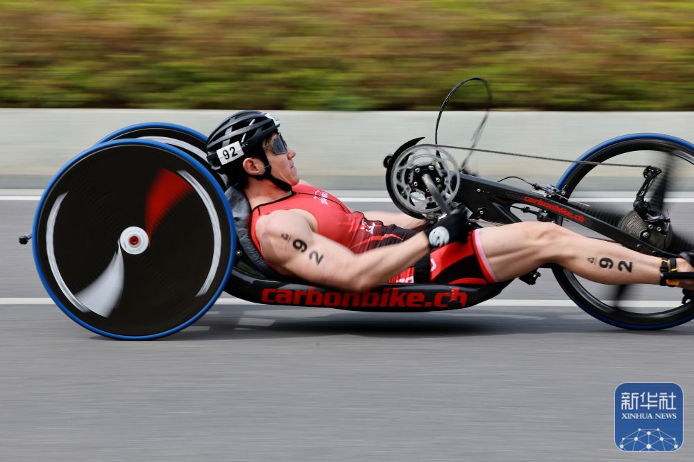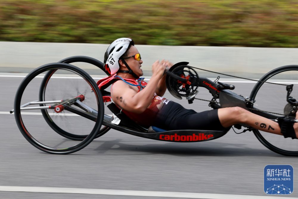 ↑ 新疆队选手邓伟在男子PTS2级别自行车比赛中,最终他获得该级别铜牌。