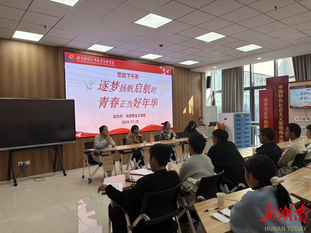 湖南日报·新湖南客户端11月28日讯(通讯员 刘彩风)为深化思想政治教育工作,搭建师生互动交流的暖心平台,近日,湖南财经工业职业技术学院马克思主义学院举办第九期“逐梦扬帆起航时 青春正当好年华”主题思政下午茶活动。活动由该校汽车工程学院专任教师谢文辰、会计学院辅导员刘凯、心理健康咨询师周燕平担任嘉宾,各二级学院2025级学生代表及思政课教师代表共40余人参加。