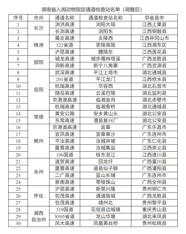 湖南日报11月28日讯(全媒体记者 胡盼盼 通讯员 武深树)为加强入湘动物指定通道管理,发挥指定通道检查站防疫堵疫作用,结合交通路网和养殖结构变化,湖南省农业农村厅、省公安厅、省交通运输厅发布《关于调整部分入湘动物指定通道的通告》,对部分入湘动物指定通道进行调整优化。