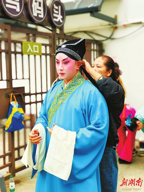 此次演出是由长沙市委宣传部、市文旅广电局举办的送戏下乡进社区(村)文化惠民演出。惠民演出的地点一般是茶馆小舞台、演出车或临时搭建的舞台,演出环境和条件差,现场化妆和卸妆时间都很紧张,这对演员是很大的考验。比如这次演出的朝晖楼茶馆,不仅舞台很狭小,连演员穿戴整装都只能在狭窄的邻水铁门一隅。