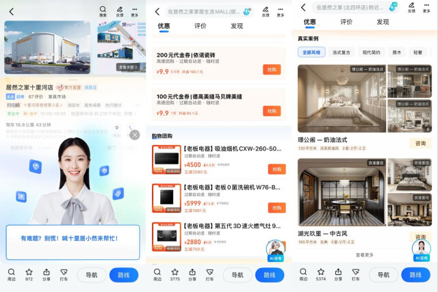 目前,已有40余家居然之家卖场入驻高德地图,用户在高德地图搜索“居然之家”或相关家装关键词时,可在门店详情页直接查看商品价格、楼层导览,并支持在线互动咨询与一键导航至门店,真正实现“搜—导—询—购”一体化体验。