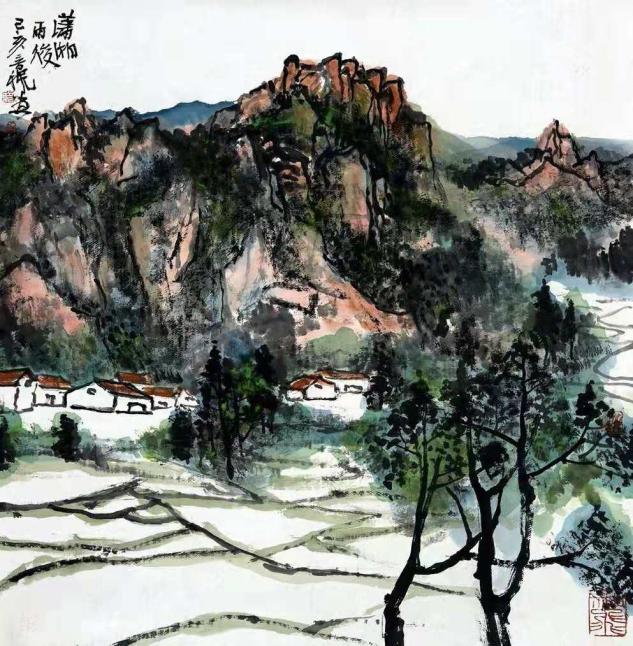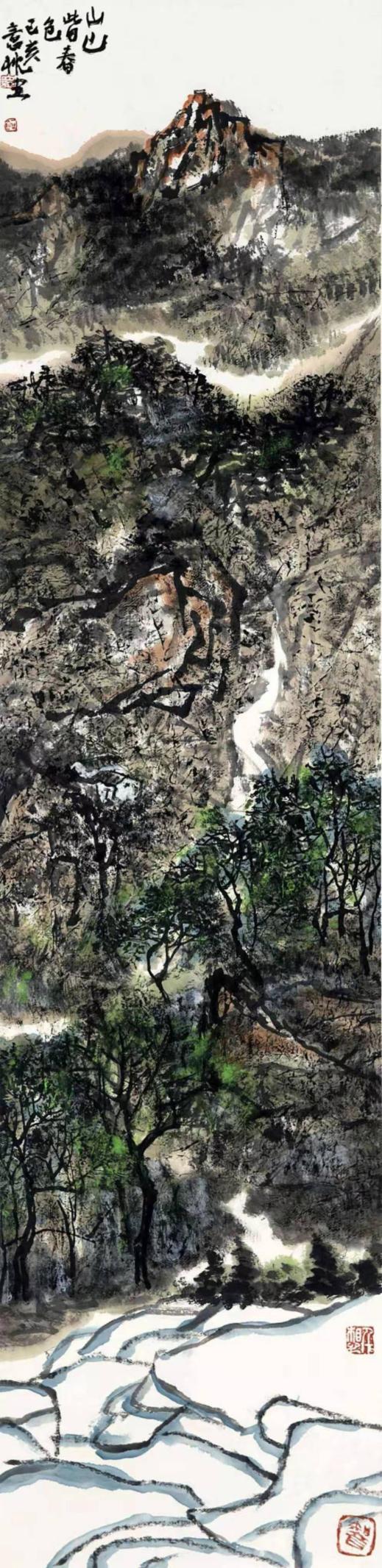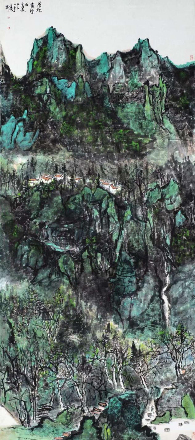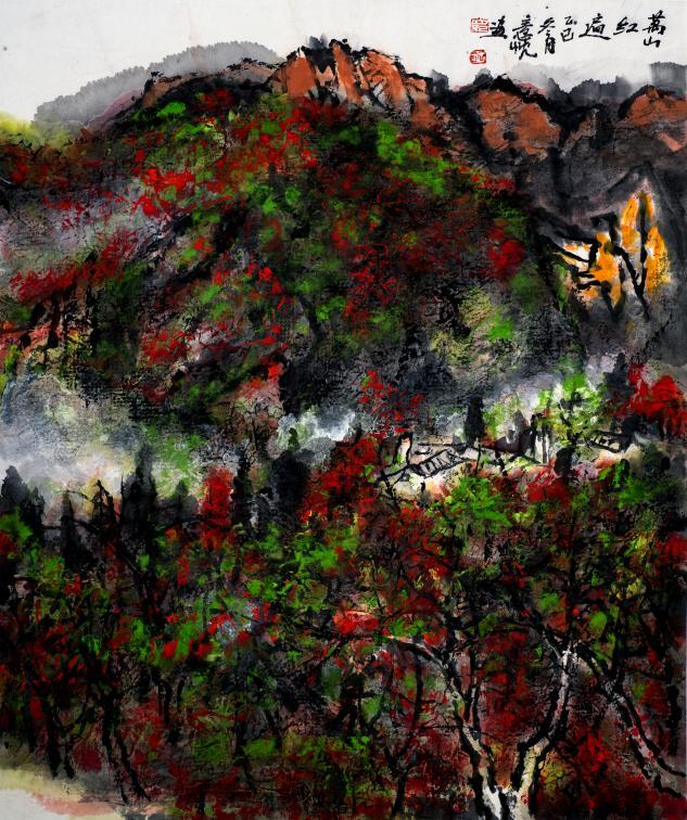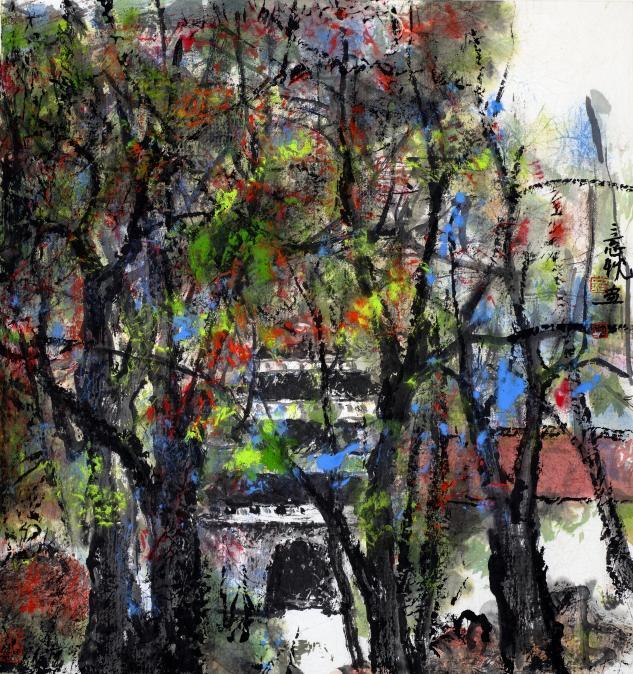 甲午年在京城798作场,观者皆疑吴冠中还魂。实则此君乃易图境帐下巡山墨鬼,朱屺瞻麾前隔世酒徒。尝以濯足盆调赭石,笑骂:“此等水墨,方配得当代!”《层林尽染》一作,竟将范宽骨力与米氏云烟,熬作湘西剁椒一瓮。程大利见之拊掌:“野狐禅念得真经文。”