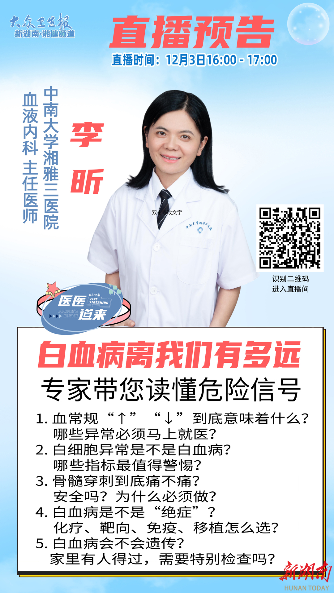 12月3日(周三)16:00—17:00,大众卫生报、新湖南湘健频道特别邀请中南大学湘雅三医院血液内科主任医师李昕作客《医医道来》直播间,为大家科普白血病防治方面的相关知识。敬请关注。