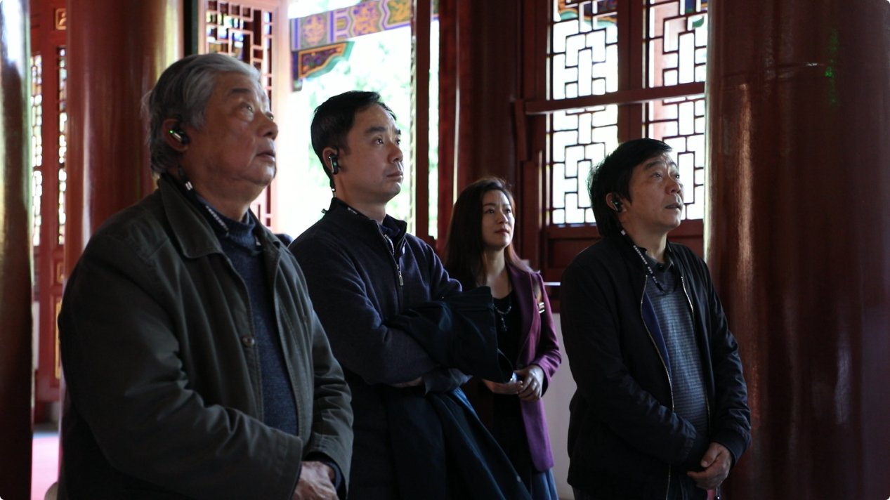 ▲文艺创作者们在九嶷山舜帝陵观摩书法字体(蔡兴 摄)