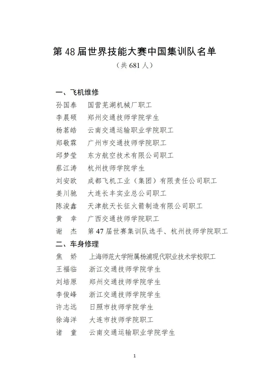 按照《人力资源社会保障部关于举办中华人民共和国第三届职业技能大赛的通知》(人社部函〔2025〕16号)规定,根据中华人民共和国第三届职业技能大赛世赛选拔项目比赛成绩、第47届世界技能大赛各项目集中考核排名和世界技能组织对第48届世界技能大赛参赛选手年龄要求,确定孙国泰等681人入围第48届世界技能大赛中国集训队。
