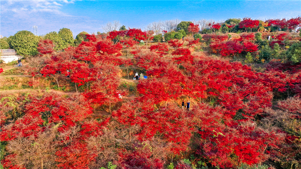 入冬时节寒意渐浓,邵阳市北塔生态园内的红枫却依旧叶色浓艳,成为市民休闲打卡的热门地标。