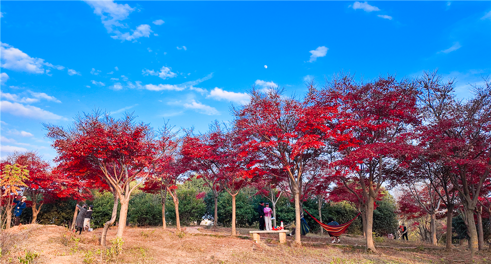 走进核心枫林区,阳光透过叶片洒下斑驳光影,微风吹过,枫叶沙沙作响,宛如大自然的轻吟浅唱。“这里的红枫全年都这么艳,坐在帐篷里抬头就是红色的‘天空’,太舒服了!”市民李女士和家人在枫树下搭起帐篷,孩童在落叶堆里嬉戏,笑声与枫叶声交织成趣。