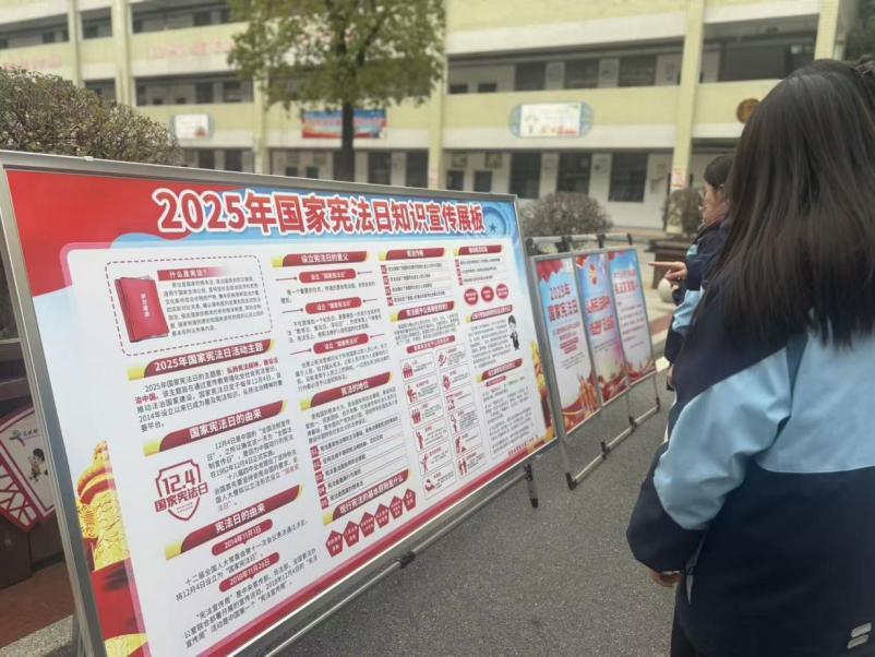 与此同时,学校在教学楼各楼层设置了宪法知识宣传展板,吸引众多学生驻足观看。展板图文并茂,生动呈现宪法的地位、作用、历程及公民权利义务等内容。课间时分,同学们或静静阅读,或结伴交流,在轻松氛围中学习宪法,感受法治力量。这些展板成为校园里一道独特的普法风景,拓展了宪法学习的形式与空间。