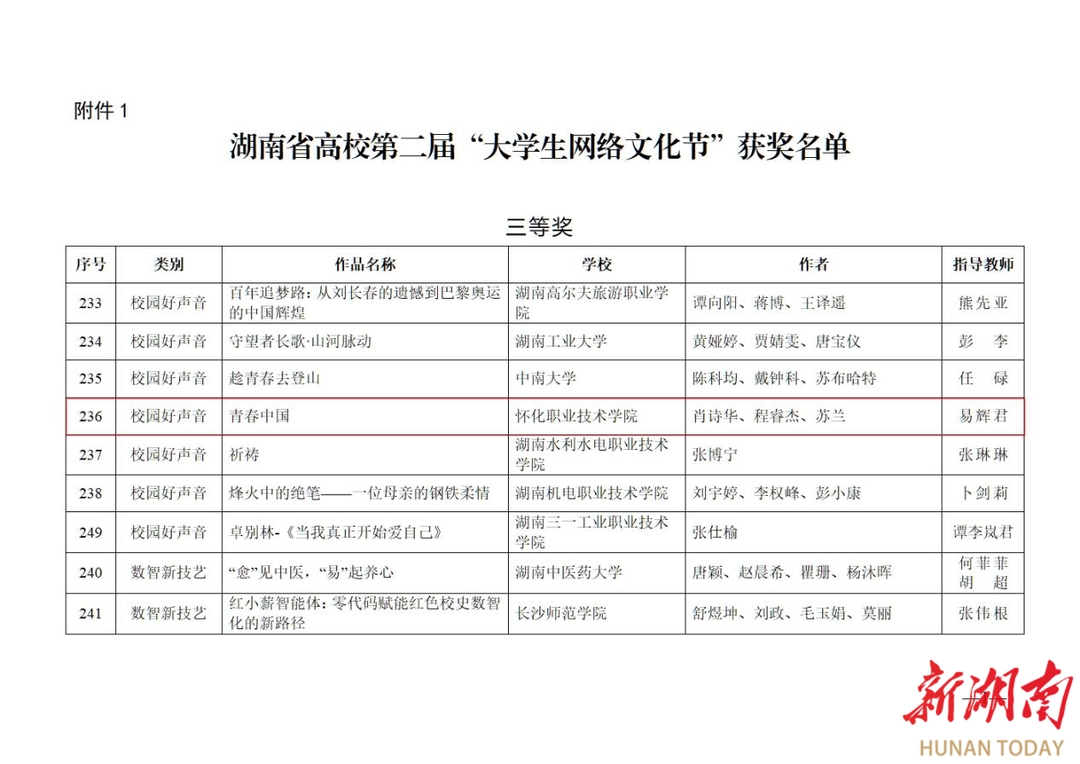 湖南日报·新湖南客户端12月6日讯(通讯员 刘小平 易辉君)近日,由中共湖南省委网信办、省委教育工委、省教育厅联合主办的湖南省高校第二届“一节一推选”活动评选结果揭晓。怀化职业技术学院选送的网络教育优秀作品《没有翅膀,所以努力向着阳光奔跑》和大学生网络文化节作品《青春中国》双双荣获三等奖。