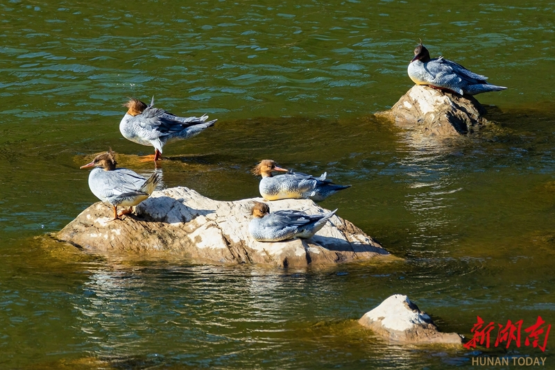 12月5日,汨罗江平江县瓮江镇段,中华秋沙鸭在此嬉戏。经观测,中华秋沙鸭种群数量达48只,这是近5年来汨罗江平江县段首次发现如此规模的中华秋沙鸭种群。近年来,该县通过深化落实河长制、巡山护林、打击非法电鱼和非法狩猎等一系列举措,助推生态环境持续向好。湖南日报全媒体记者 徐典波 通讯员 胡望龙 摄影报道